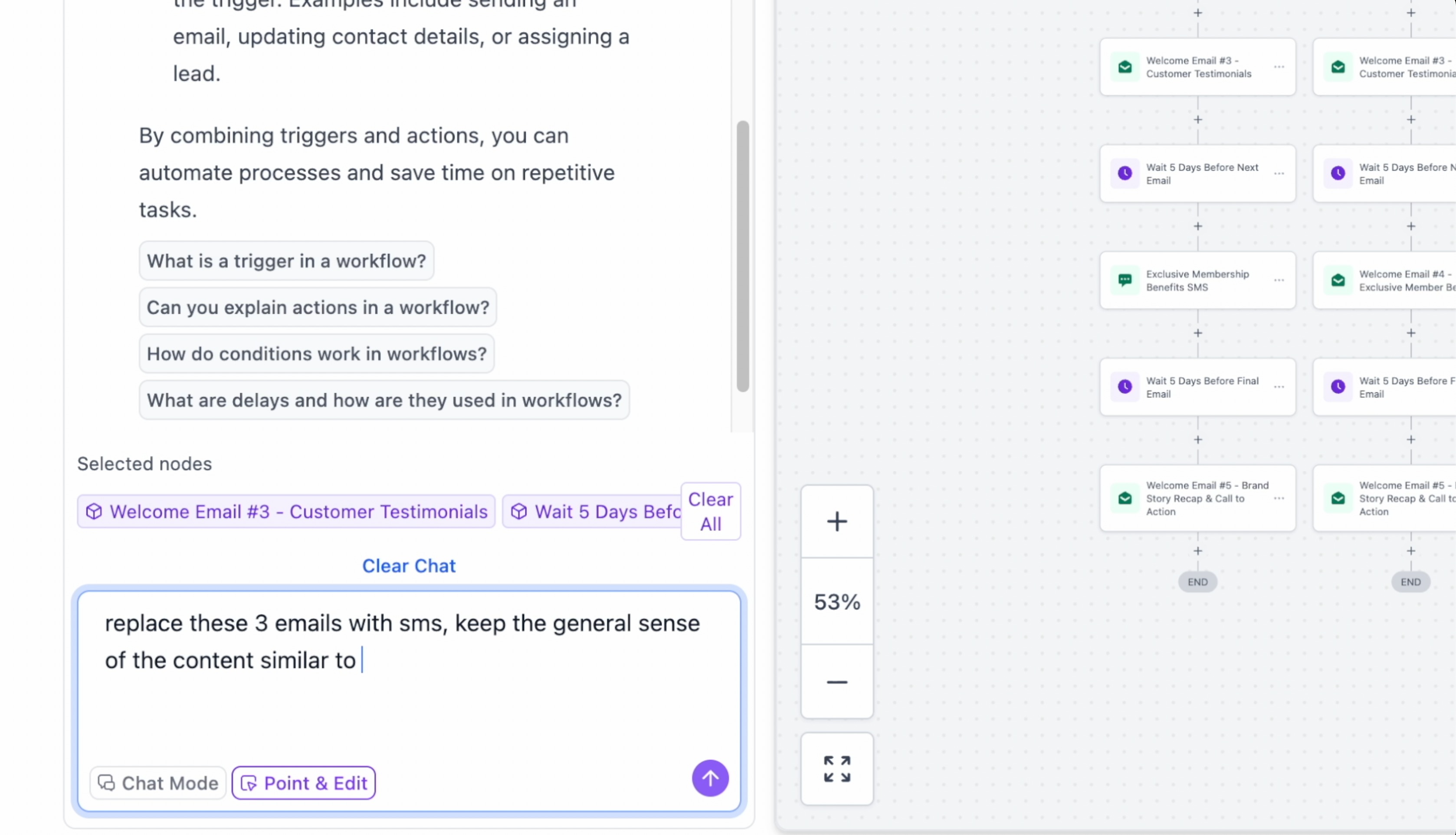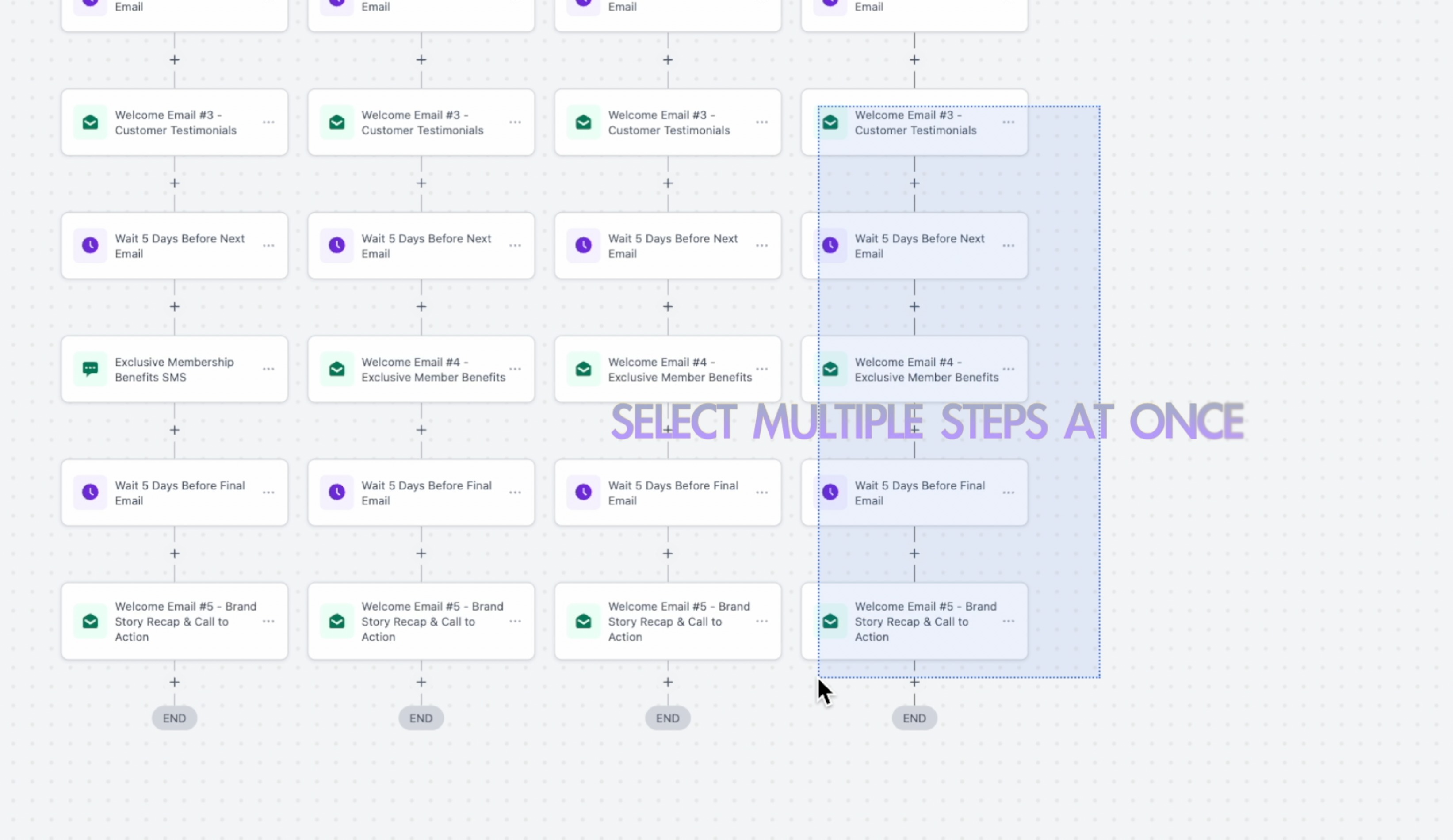 - Select 3 email actions in a sequence and say "Change all these to SMS messages"