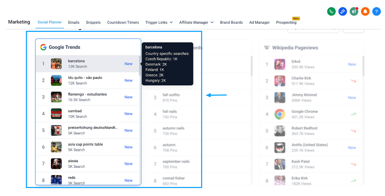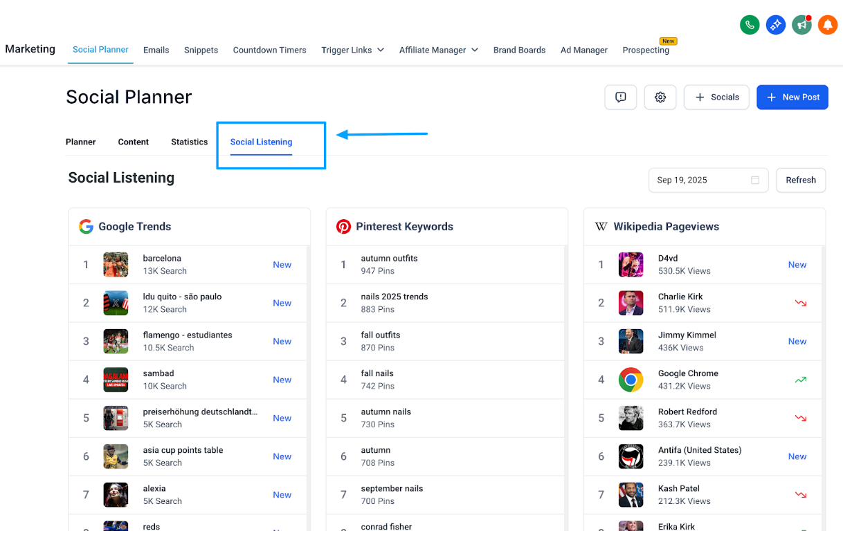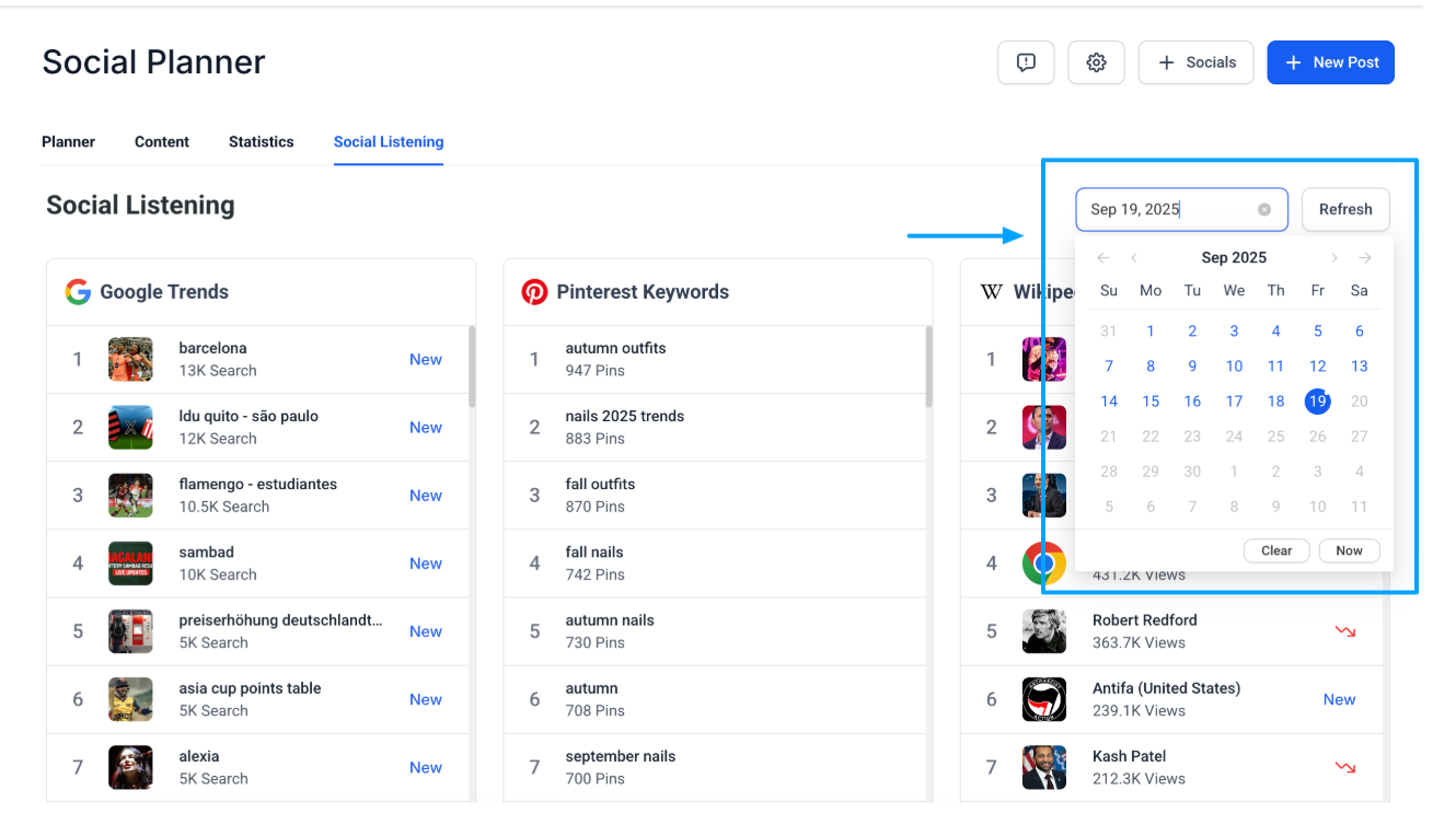 In Social Planner, Social Listening gives you real-time trend discovery from multiple sources, helping you spot rising topics and viral content before they peak.