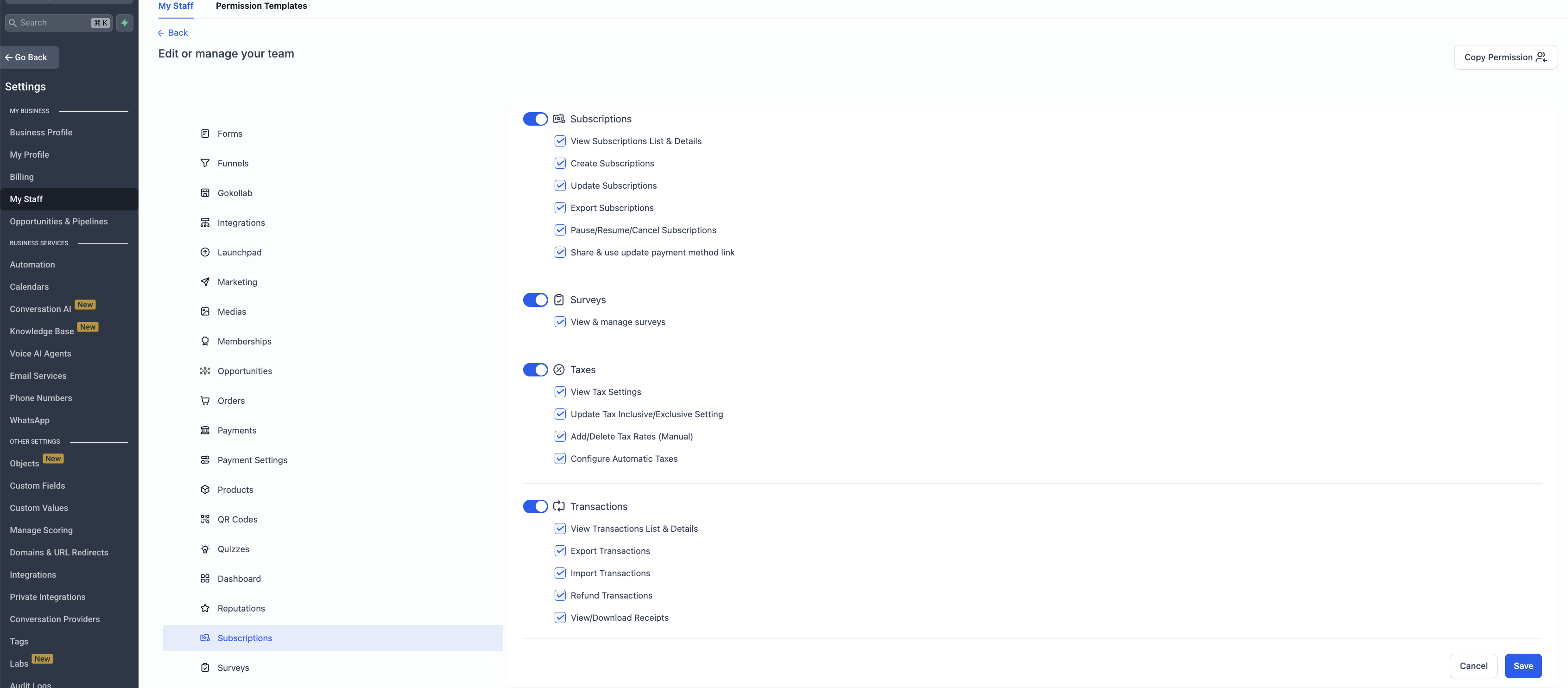 Existing permissions like “Refund Transactions” and “Manage Subscriptions” have moved into the appropriate new modules. This layout gives admins finer control over sensitive actions such as issuing refunds or editing subscriptions.