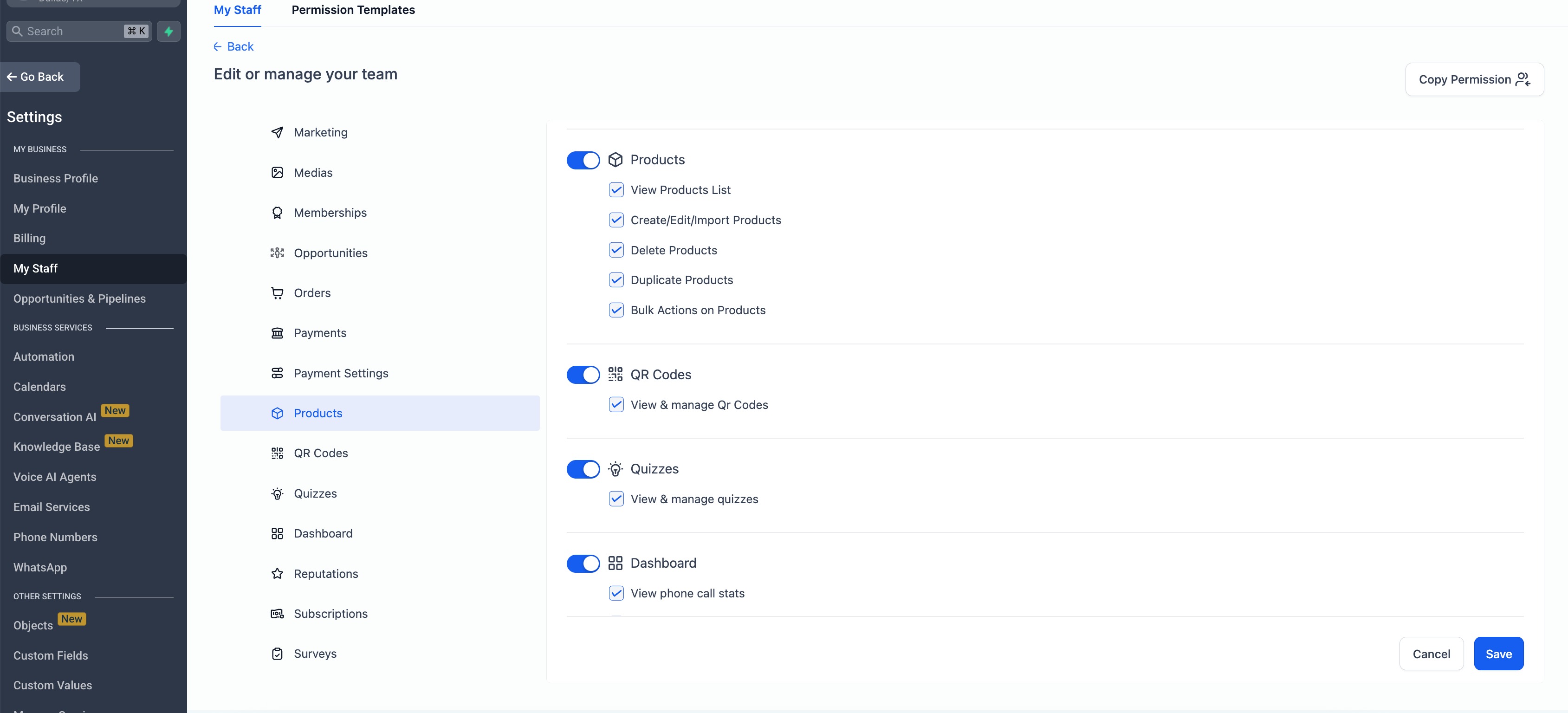 This feature breaks down payment-related permissions into separate modules so staff access can be tailored. Each module has its own toggles for common actions (view, create, update, delete, export, configure). Built-in safeguards ensure dependent actions are enforced automatically — for example, bulk product actions are only available when “Create/Edit” is granted. This exists alongside the primary 'Payments' permissions.