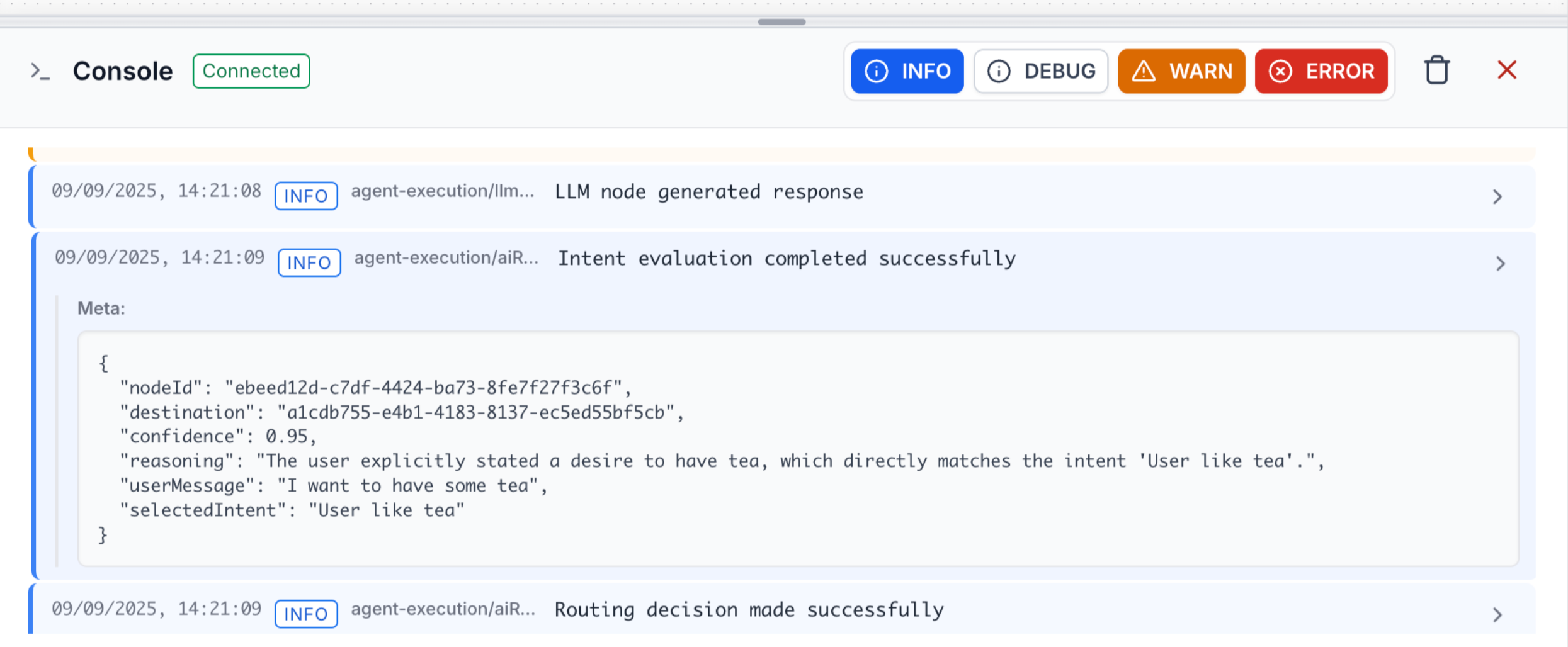 Enhanced logging provides clear visibility into the routing process, making it easier to understand the LLM’s decision-making process. This detailed logging displays the detected intent, the reasoning behind the routing decision, and the associated confidence score. Such insights are invaluable for debugging and refining your workflow configurations while ensuring that conversations are routed correctly.