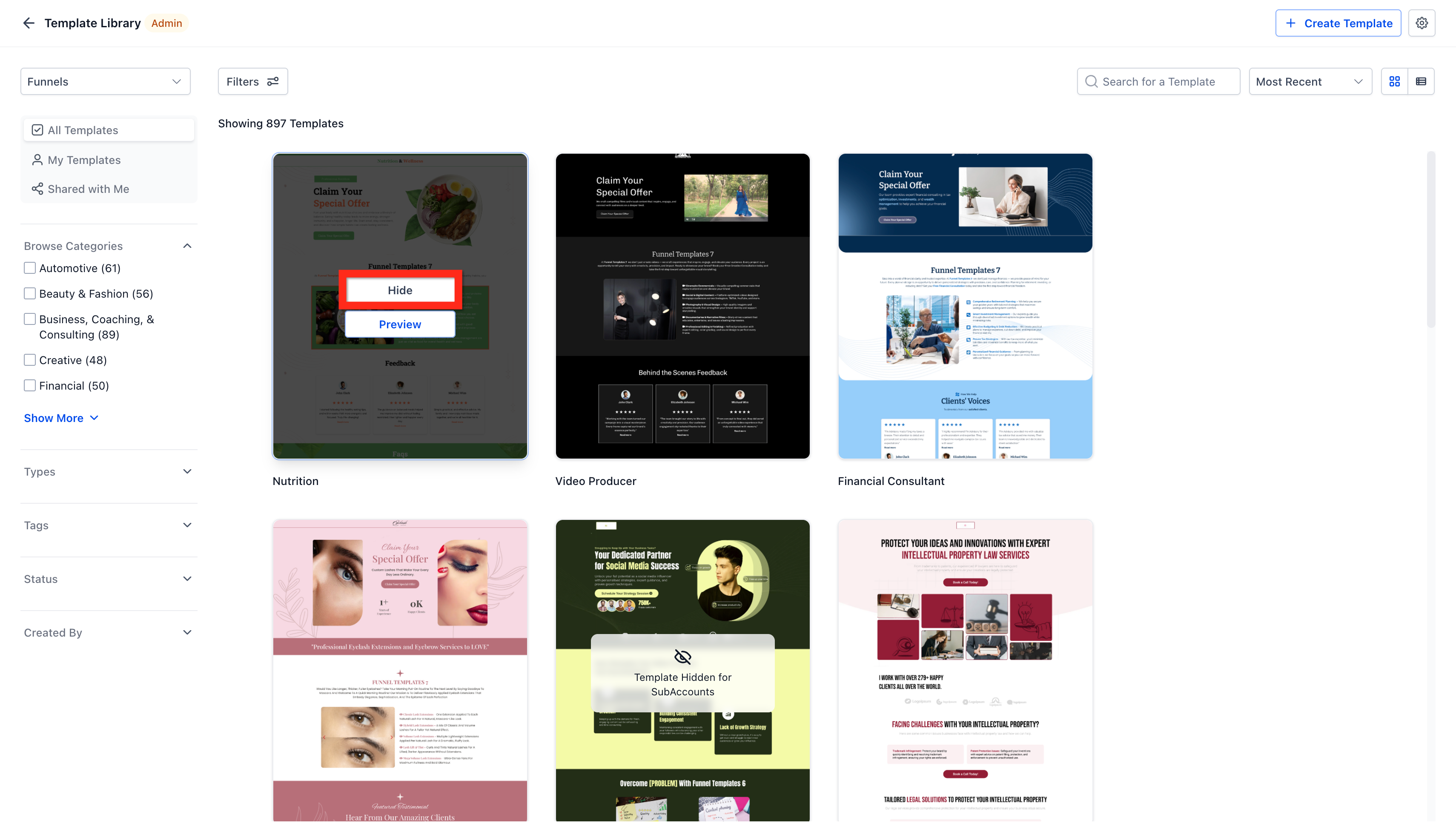 Hiding prevents a specific template from appearing anywhere in sub-accounts, safeguarding your agency’s brand or niche focus. Navigate to Agency → Template Library. Hover over a template and click Hide. A grey “Hidden” badge confirms the change.