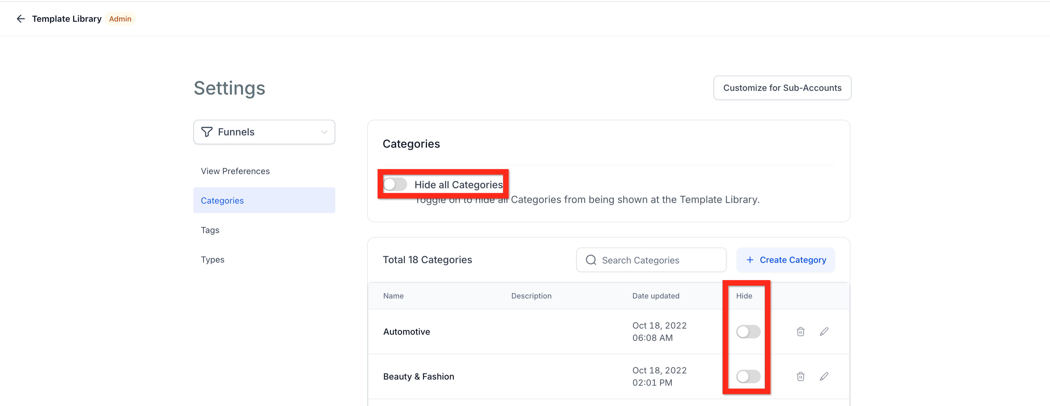 Category-level hiding is perfect when none of the templates inside a folder fit your services. Inside Template Library, click the gear icon (Settings). Choose a product (e.g., Funnels) → Categories. Toggle Hide next to any category. All templates inside become invisible to every location.