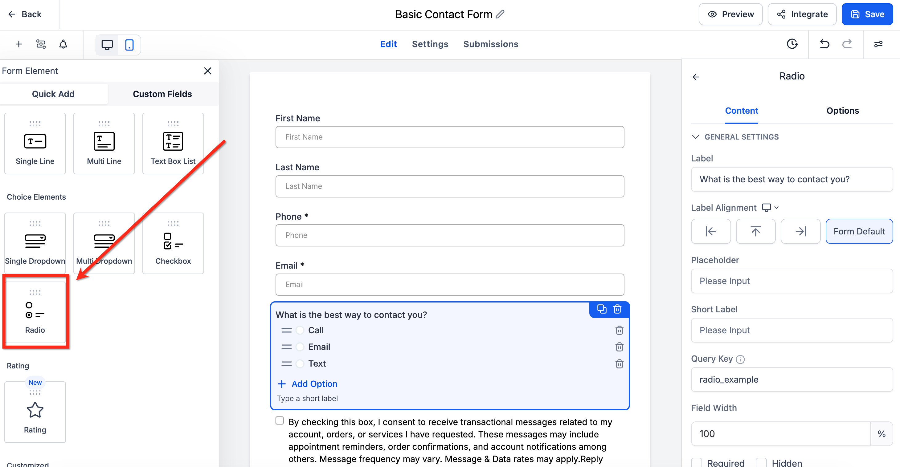 - Drag a Radio or Checkbox field onto the canvas, or click an existing one.