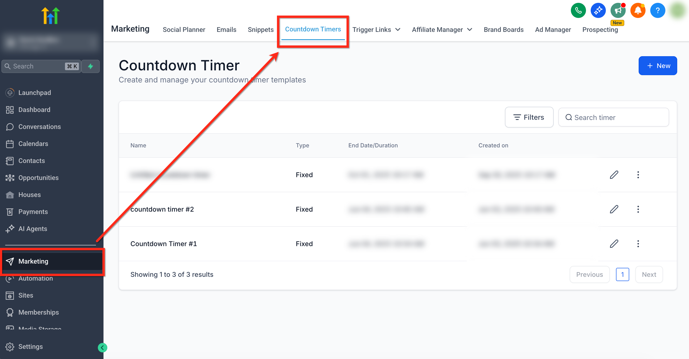 - Open an existing timer by clicking on the timer name or create a new timer by clicking + New