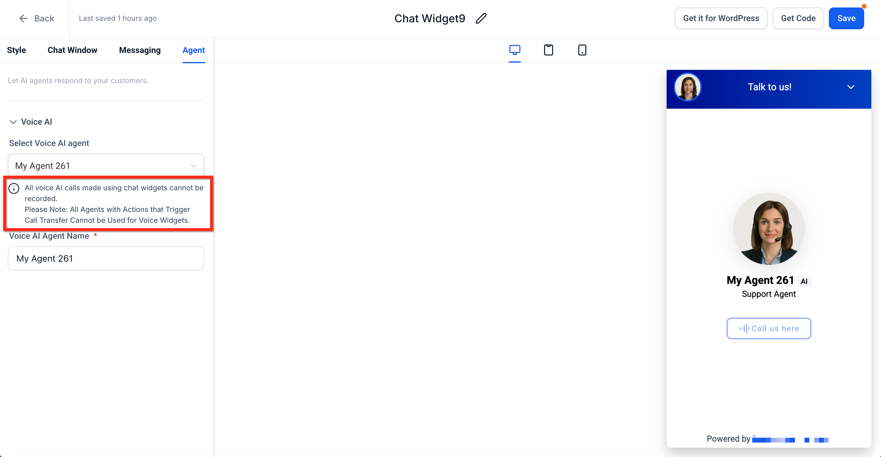 Within the Agent tab in the builder, you’ll see: “All voice AI calls made using chat widgets cannot be recorded.”