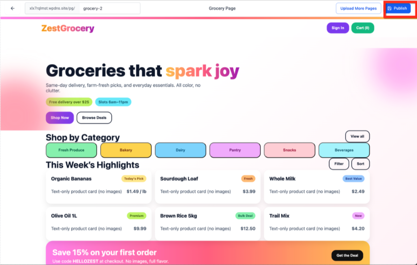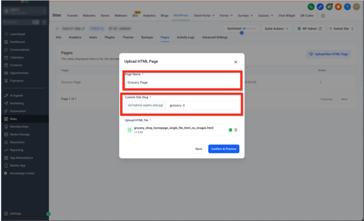 Enter a Page Name (e.g., “Grocery Page”) and a Custom Site Slug (e.g., /grocery-3).