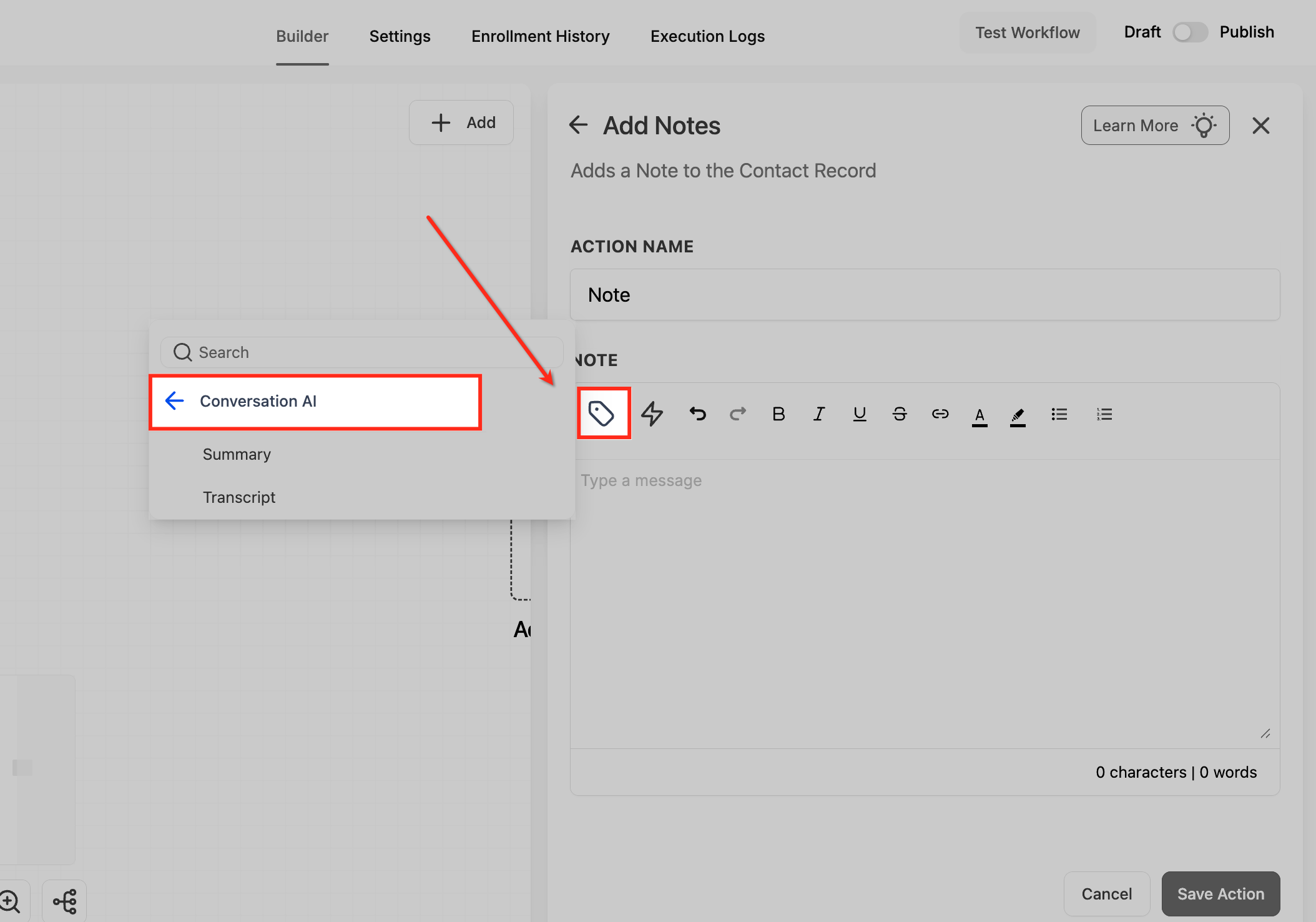 Add merge fields like Conversation AI-> Summary and Conversation AI -> Transcript