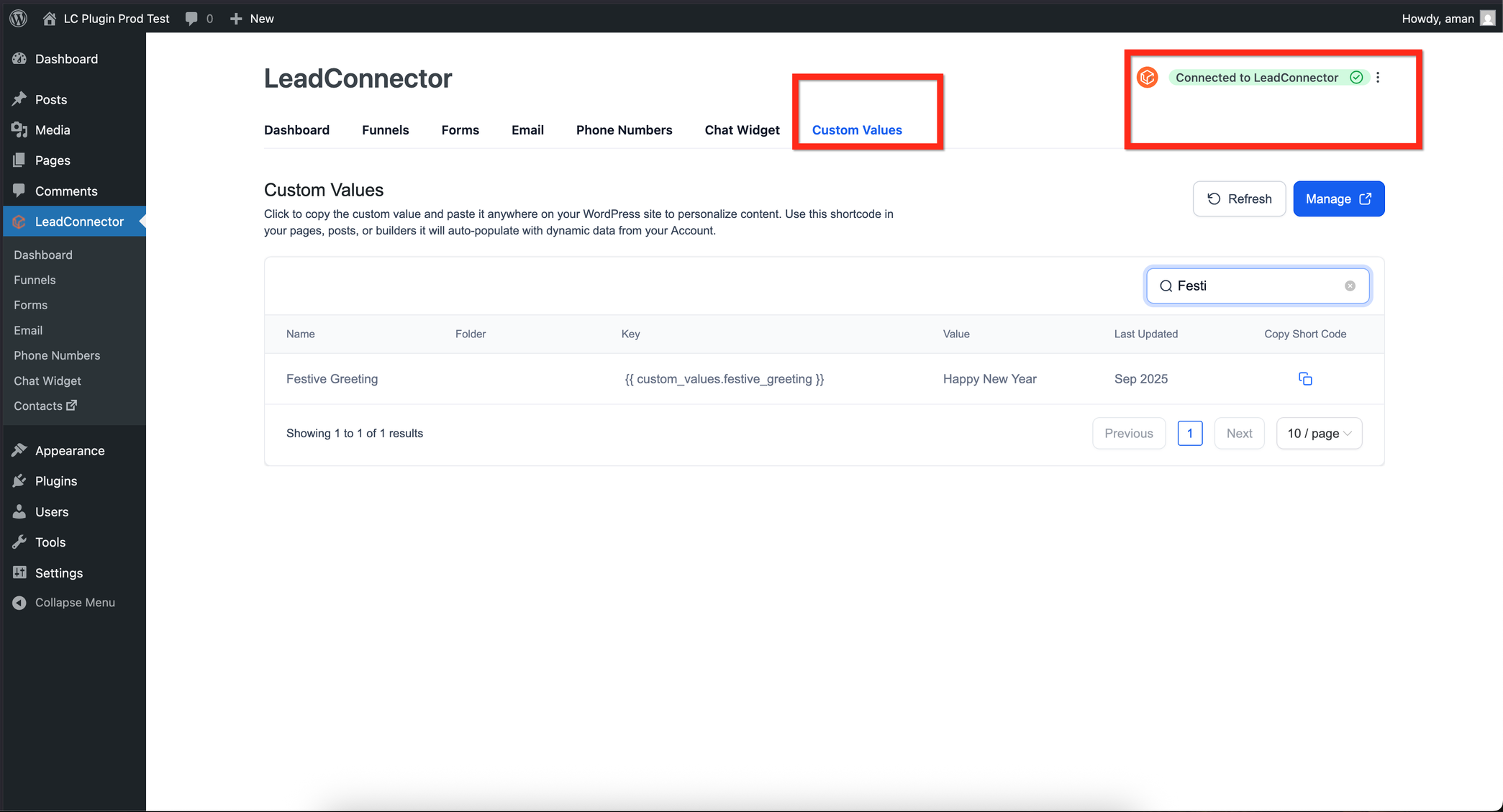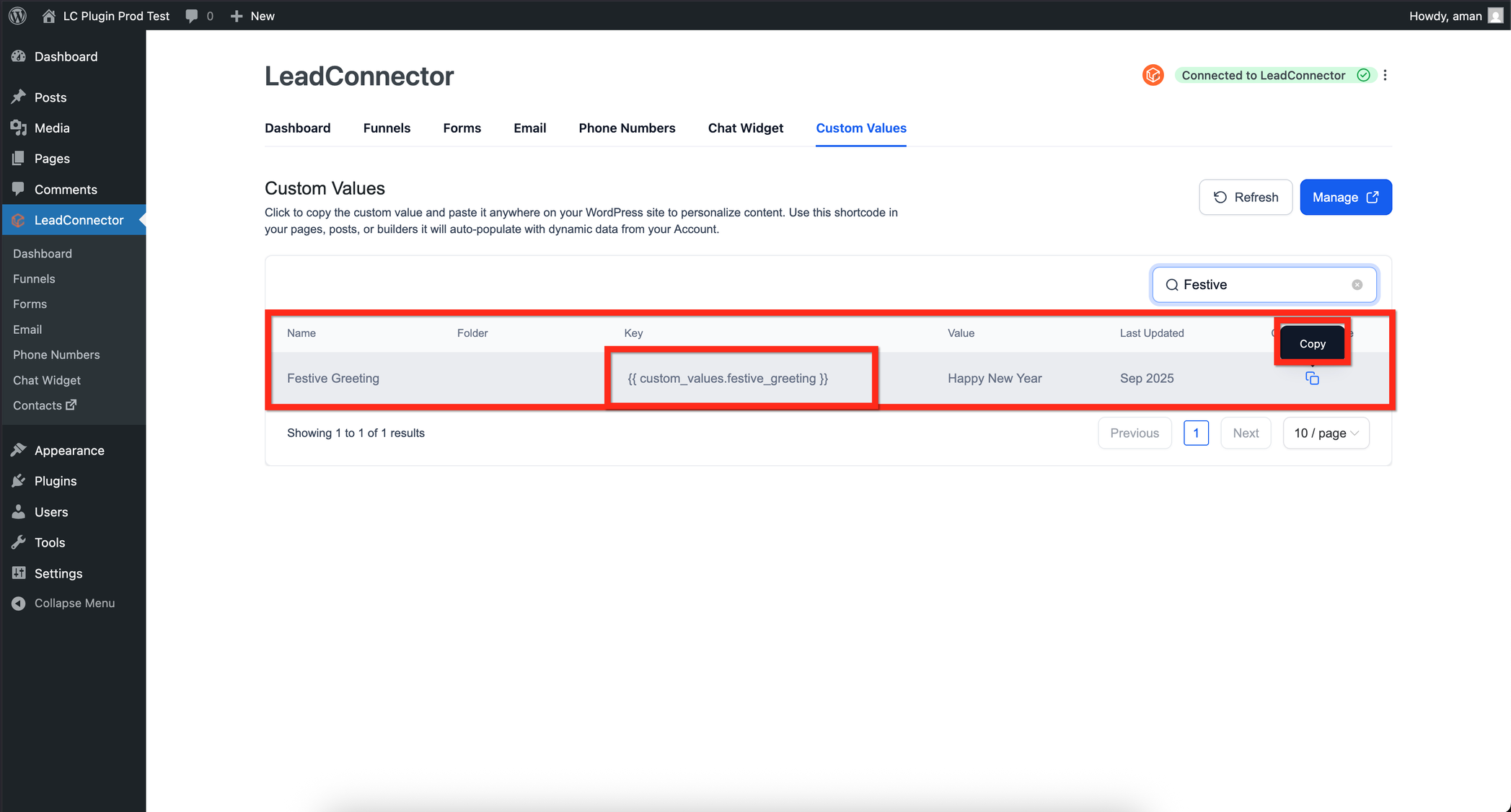 After the sync completes, open the Custom Values section in HighLevel to confirm that your data has been imported. You can then copy a shortcode and place it within any page or post using your preferred builder. When published, your WordPress content will dynamically display the synced HighLevel data in real time.