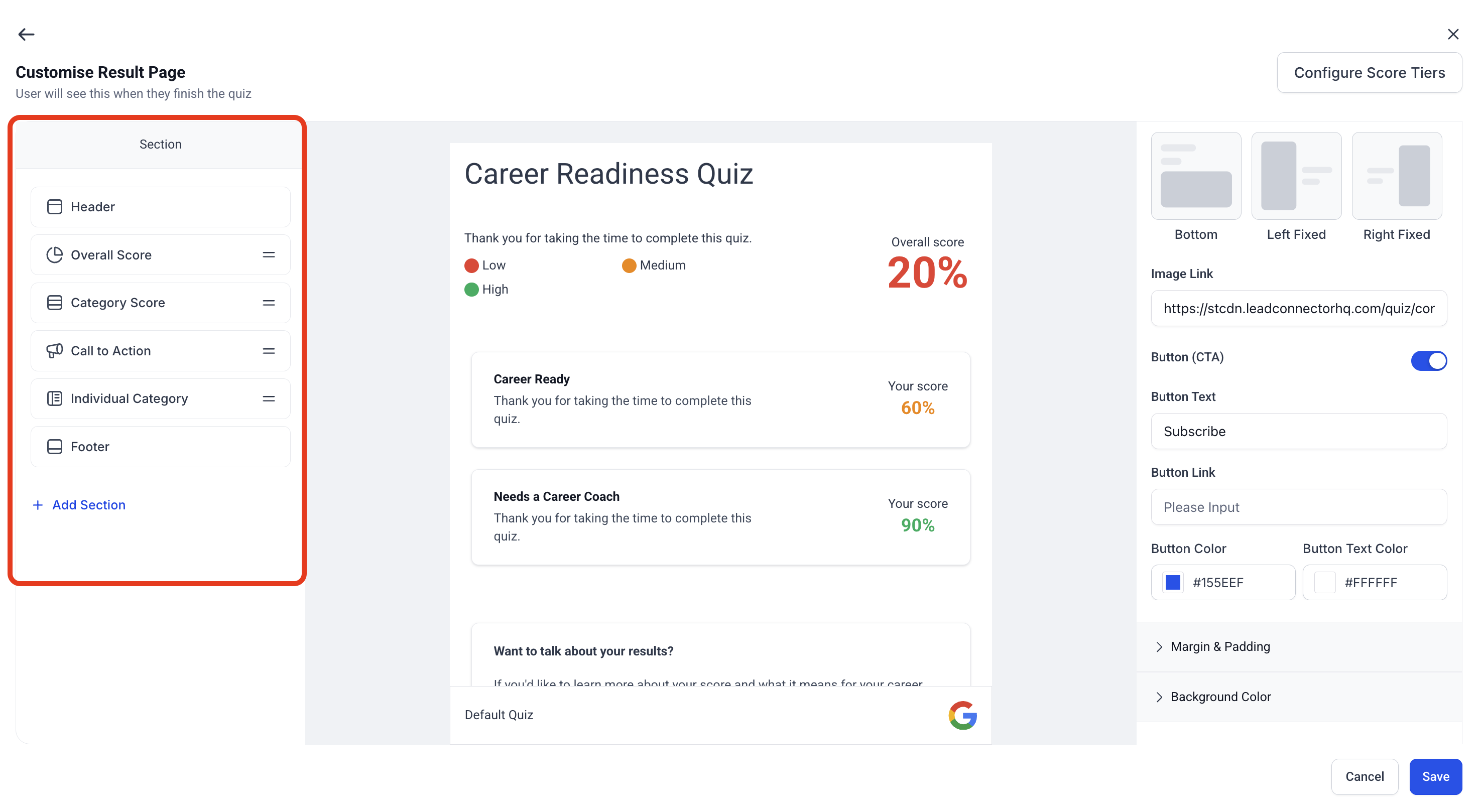 HighLevel’s enhanced Quiz Builder now includes powerful tools for customizing the Result Page — with drag-and-drop section management, section templates, visibility controls, and a unified 0–100 global score scale.