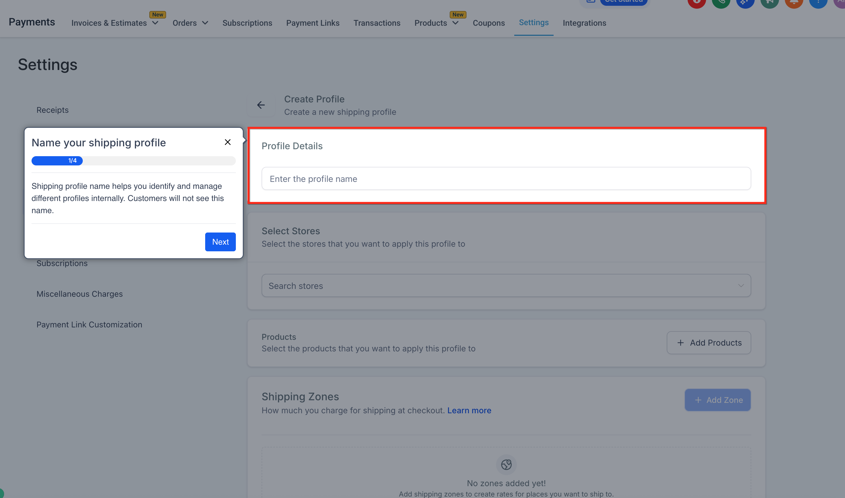 Go to Payments → Settings → Shipping & Delivery → Custom Profiles.