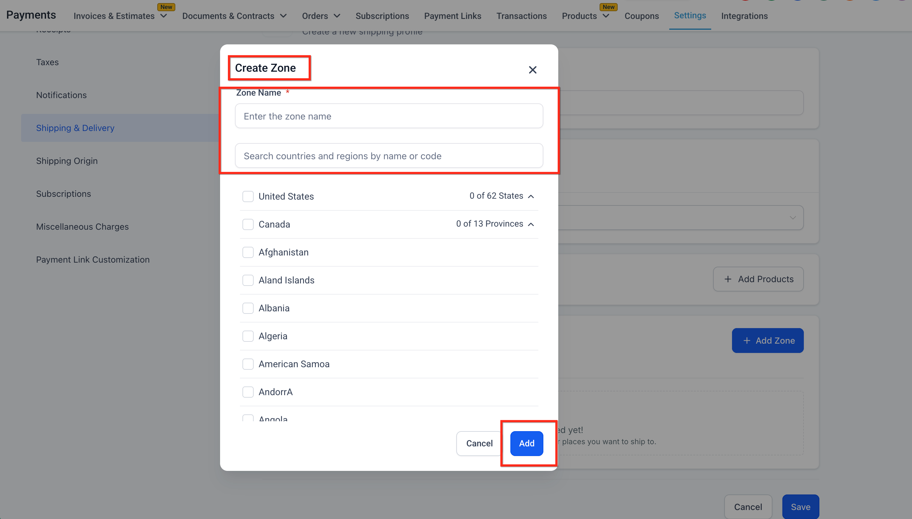 Click Add Zone and select the countries or regions you deliver to.