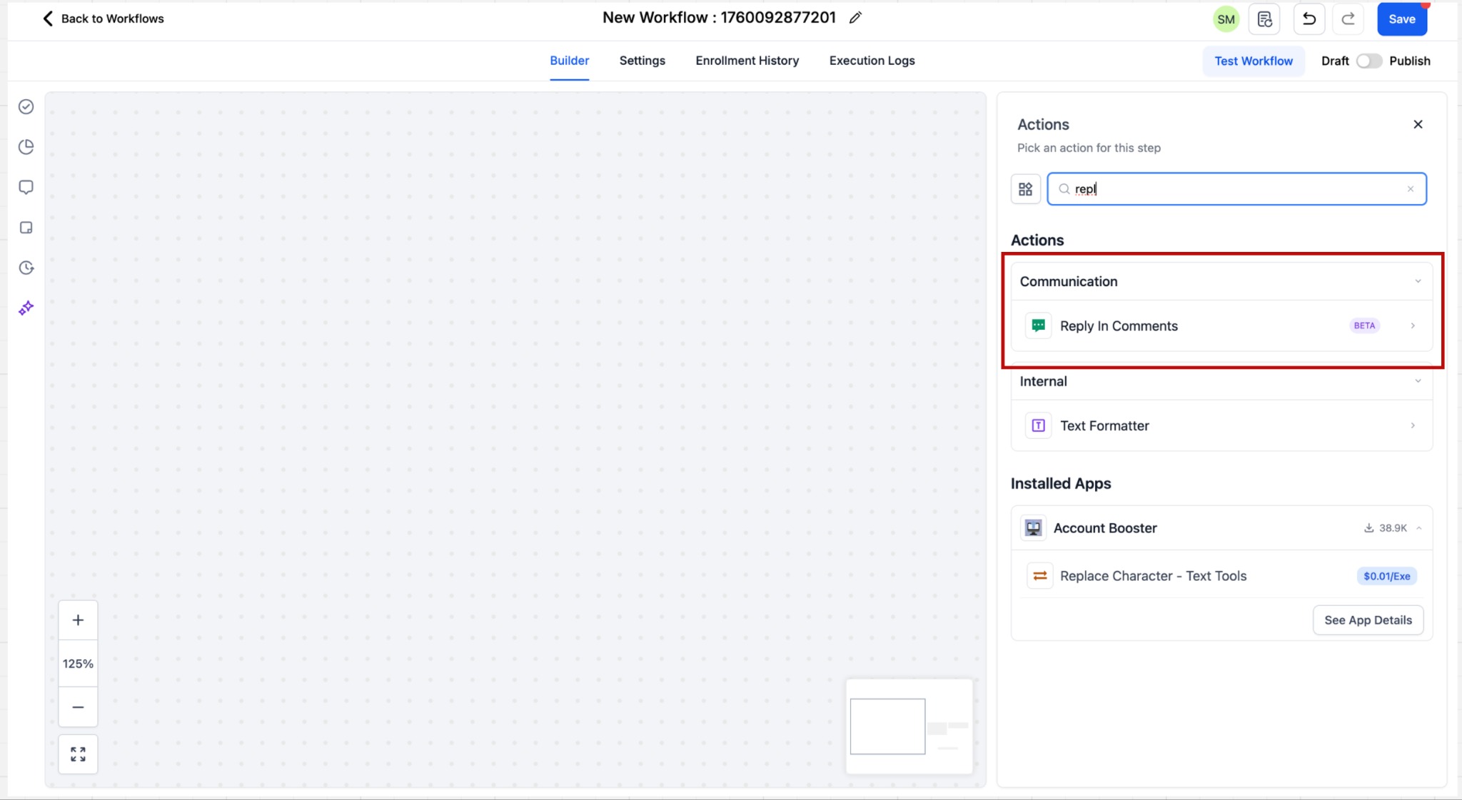 When creating a workflow click on "Add Trigger". The triggers related to comment automation are present in the Communication category. You can directly search for the trigger or scroll down to the category.