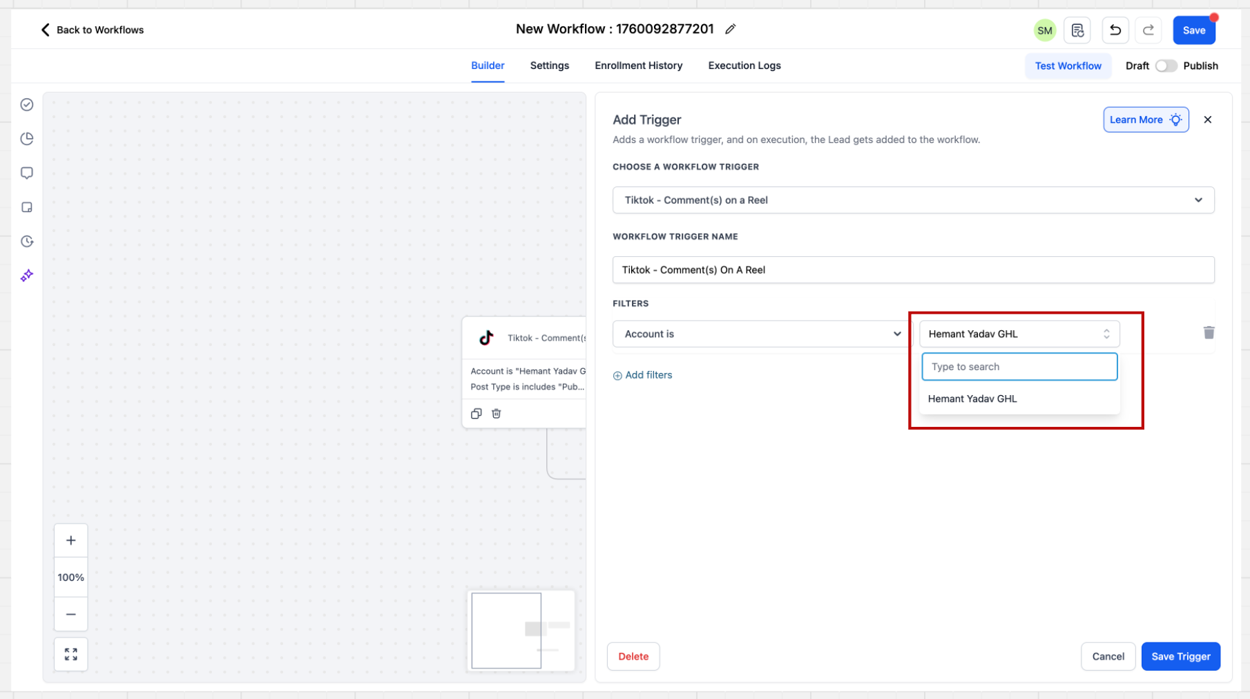 If a specific account is not selected in the filter, the system will automatically consider all accounts that are integrated at the location level. The automation will then execute across all these connected accounts.