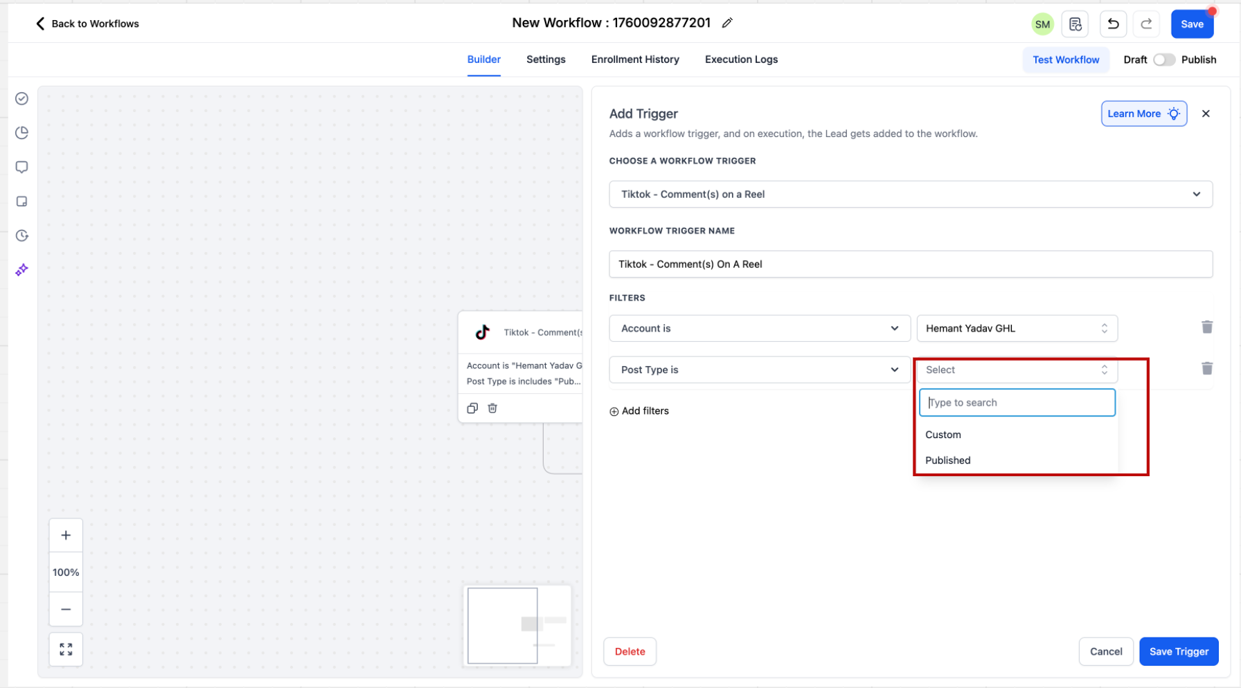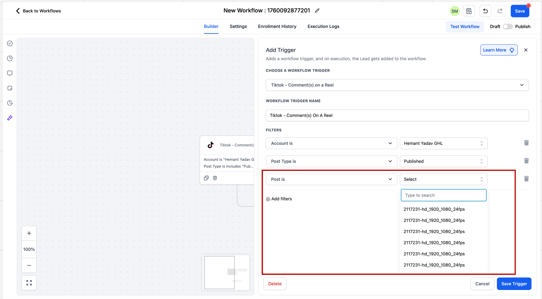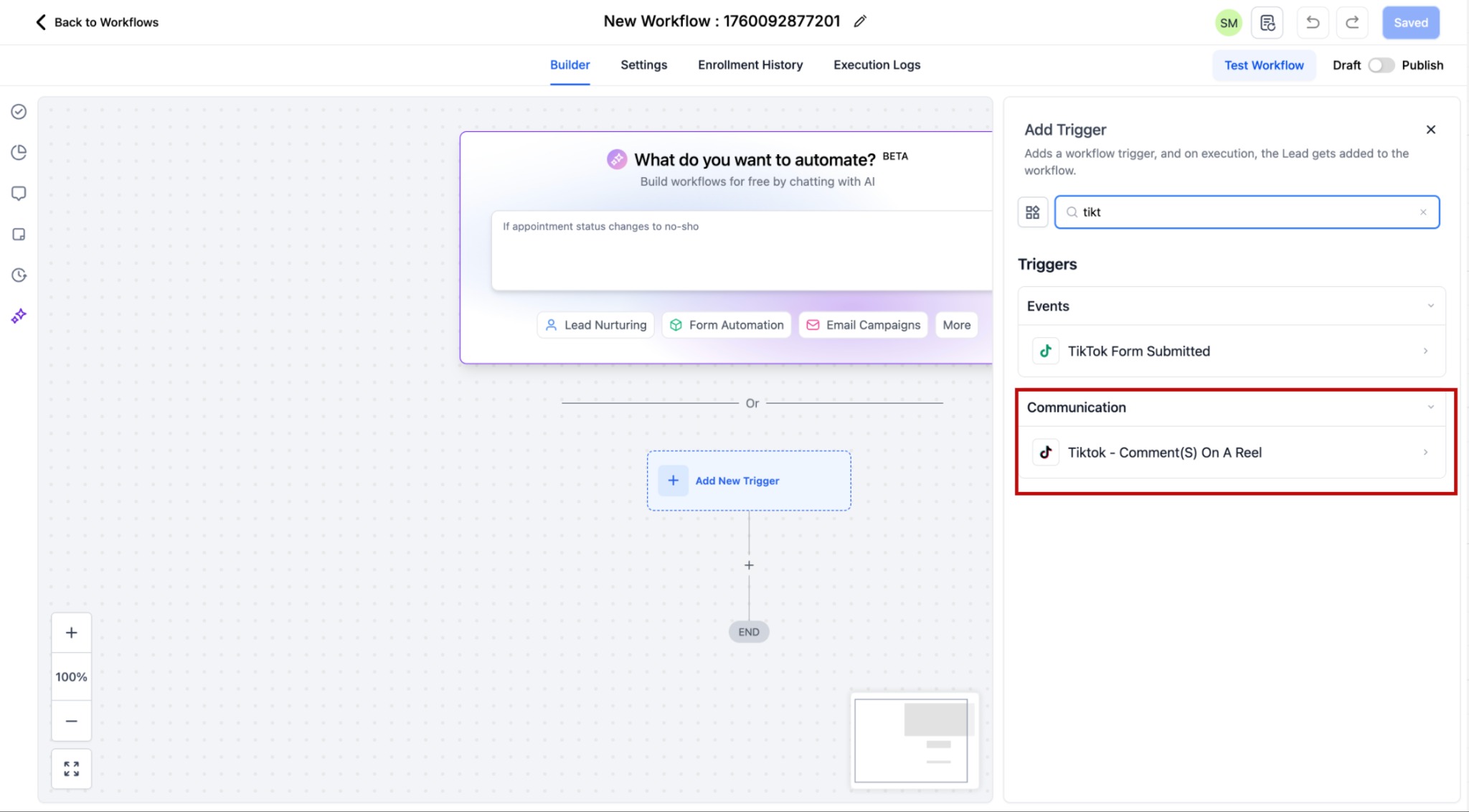 TikTok Comment on a Reel - workflow starts when there is a new comment on your TikTok post. Click here for more info on this Trigger.