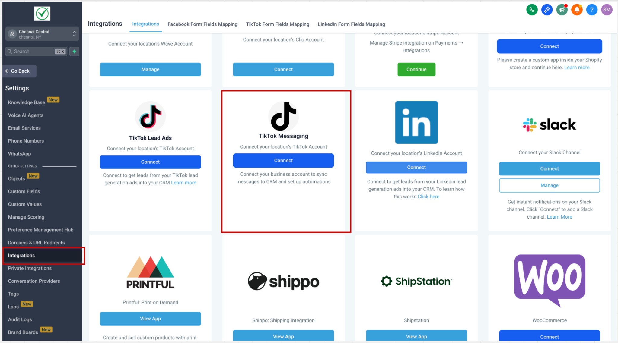 Before proceeding, make sure your TikTok accounts are integrated with your Subaccount. Go to Subaccount > Settings > Integrations > TikTok card.
