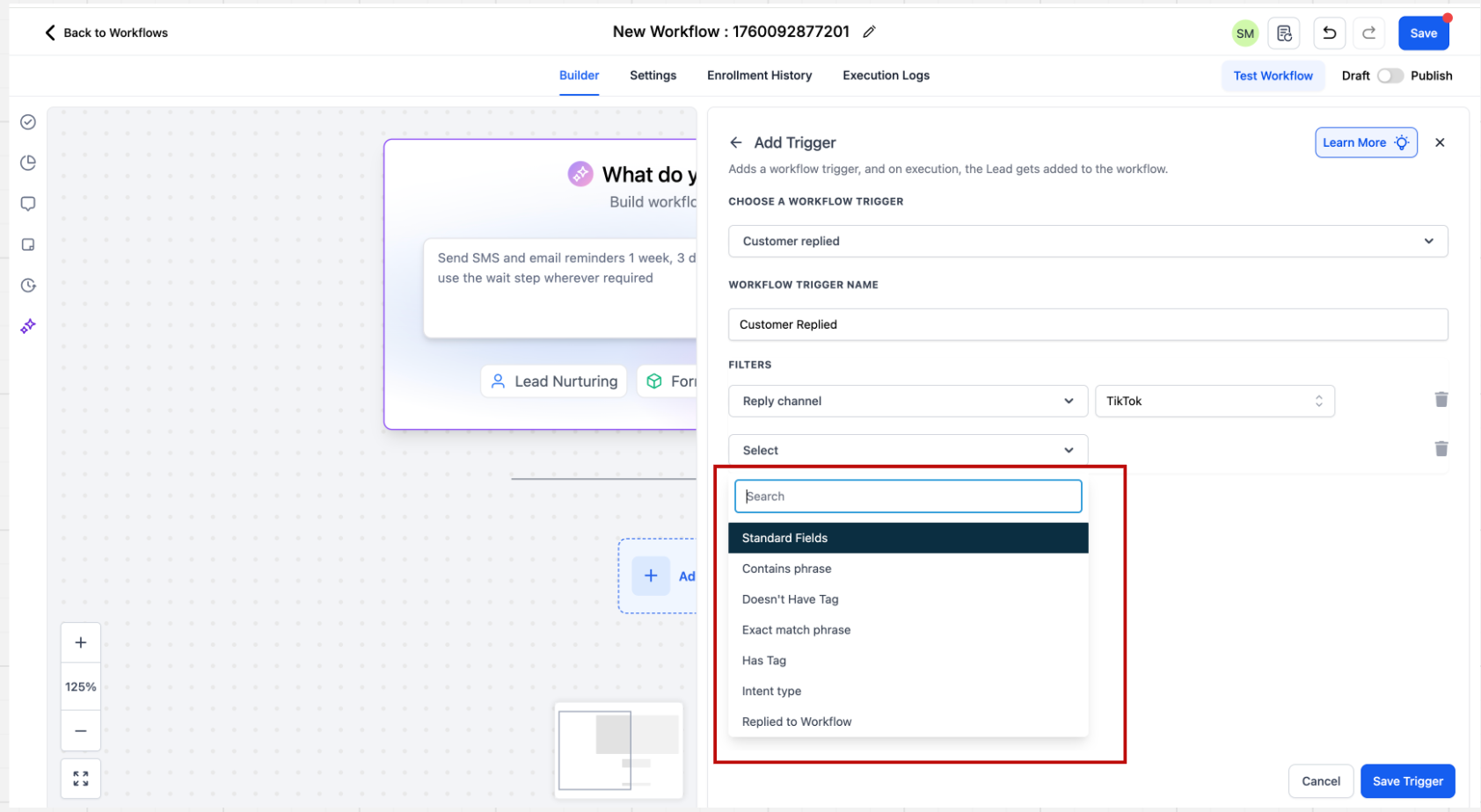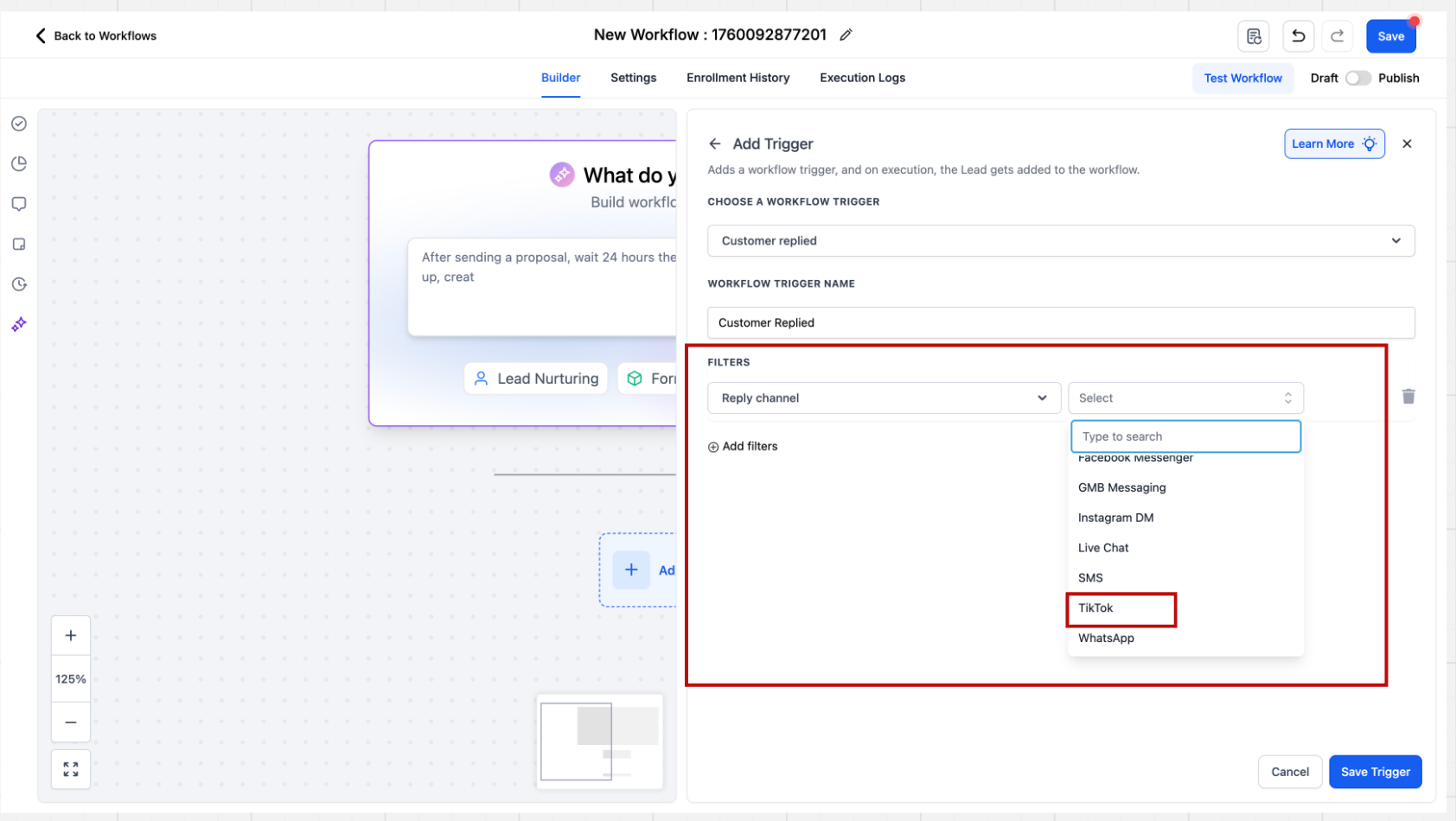 2. After clicking on the trigger the sidebar will open. There are multiple filters present here. The first step is to select the “Reply channel” filter where filter value = TikTok