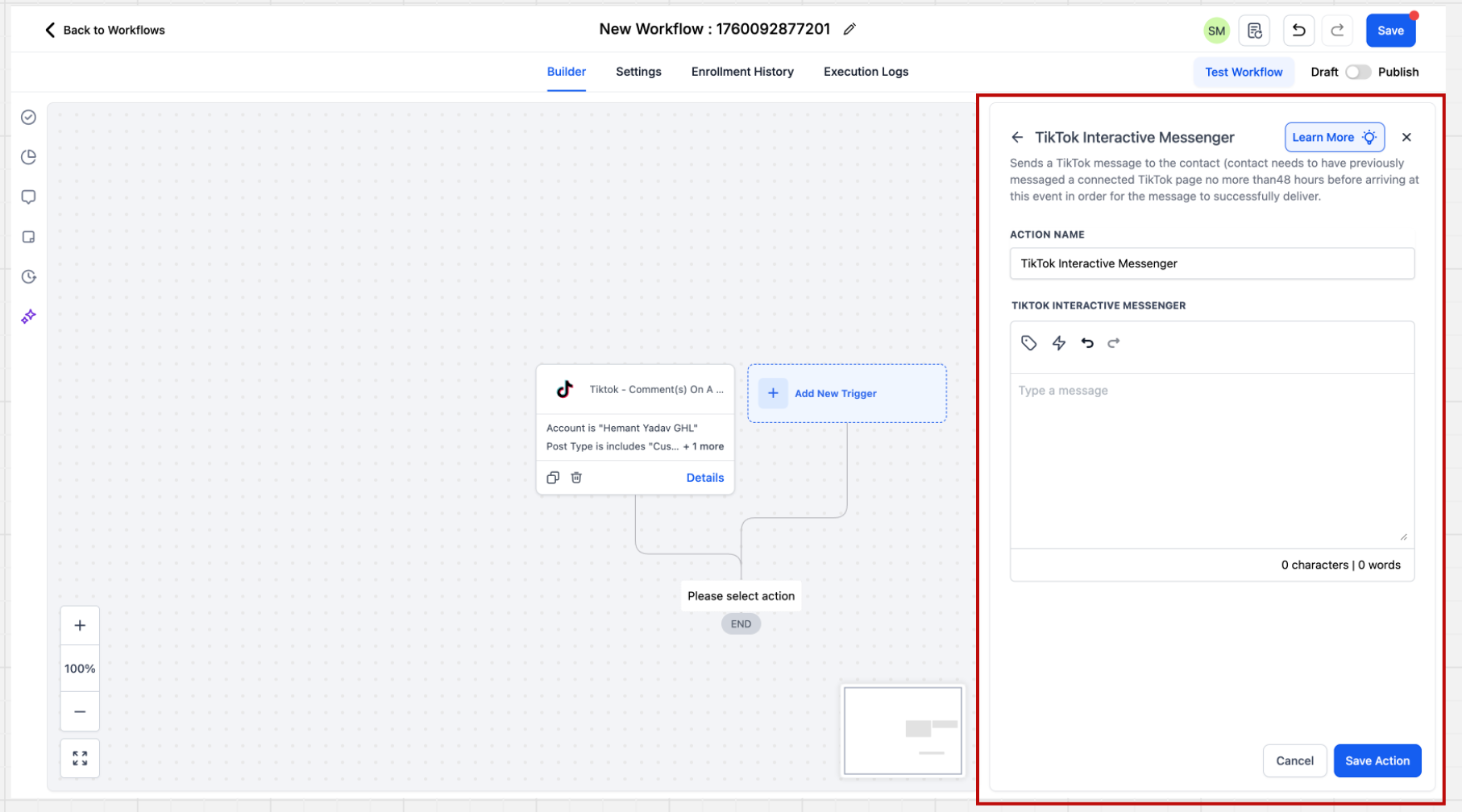 The TikTok Interactive Messenger is fairly straightforward. Here you have to provide the message you want to send to the inbound trigger defined and save the action.
