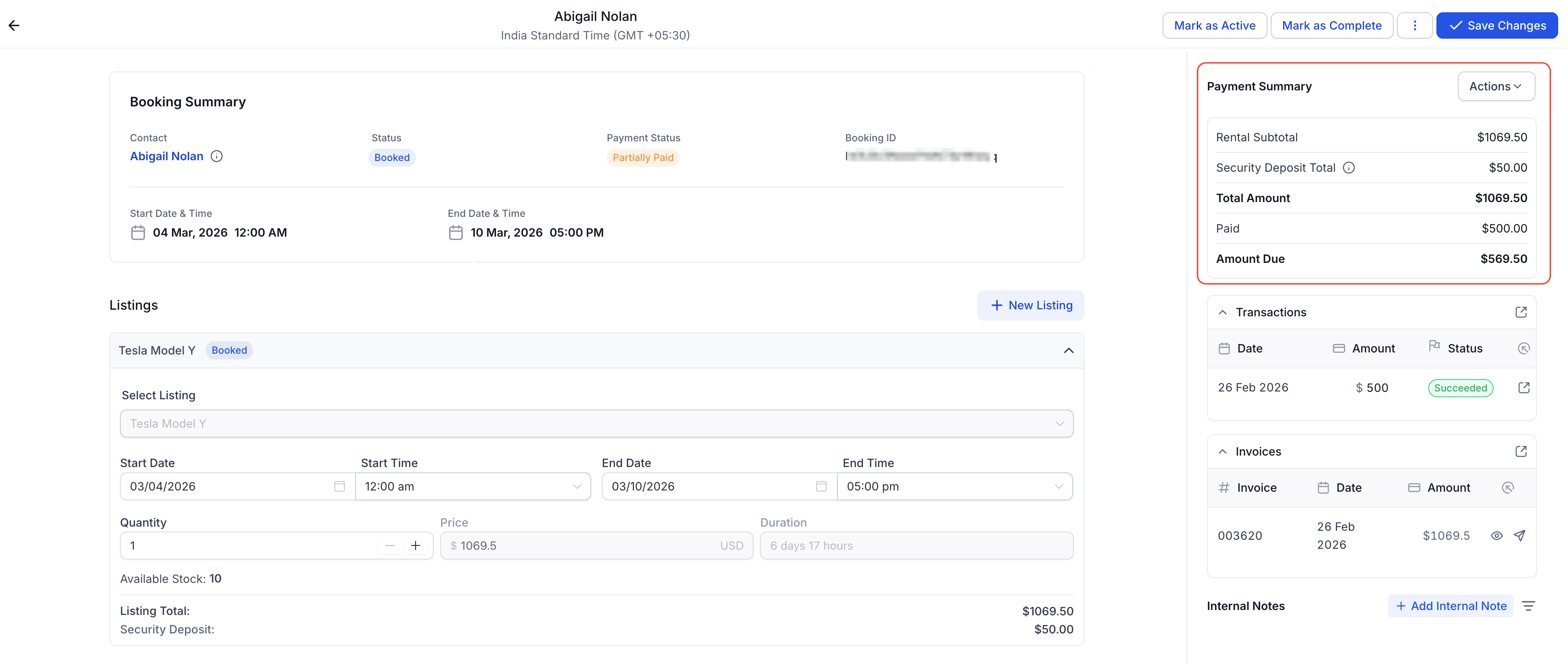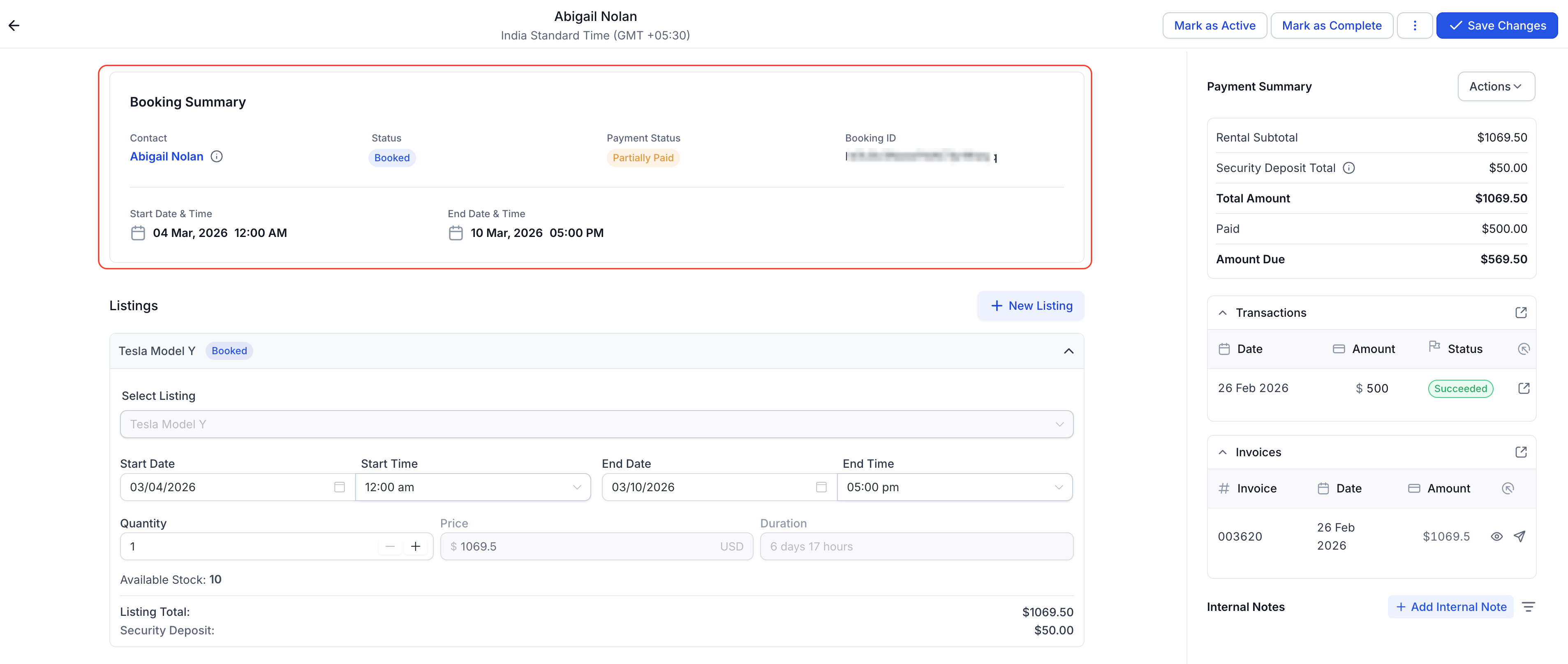 Booking Summary – Displays booking identifiers, status, payment state, and rental dates.