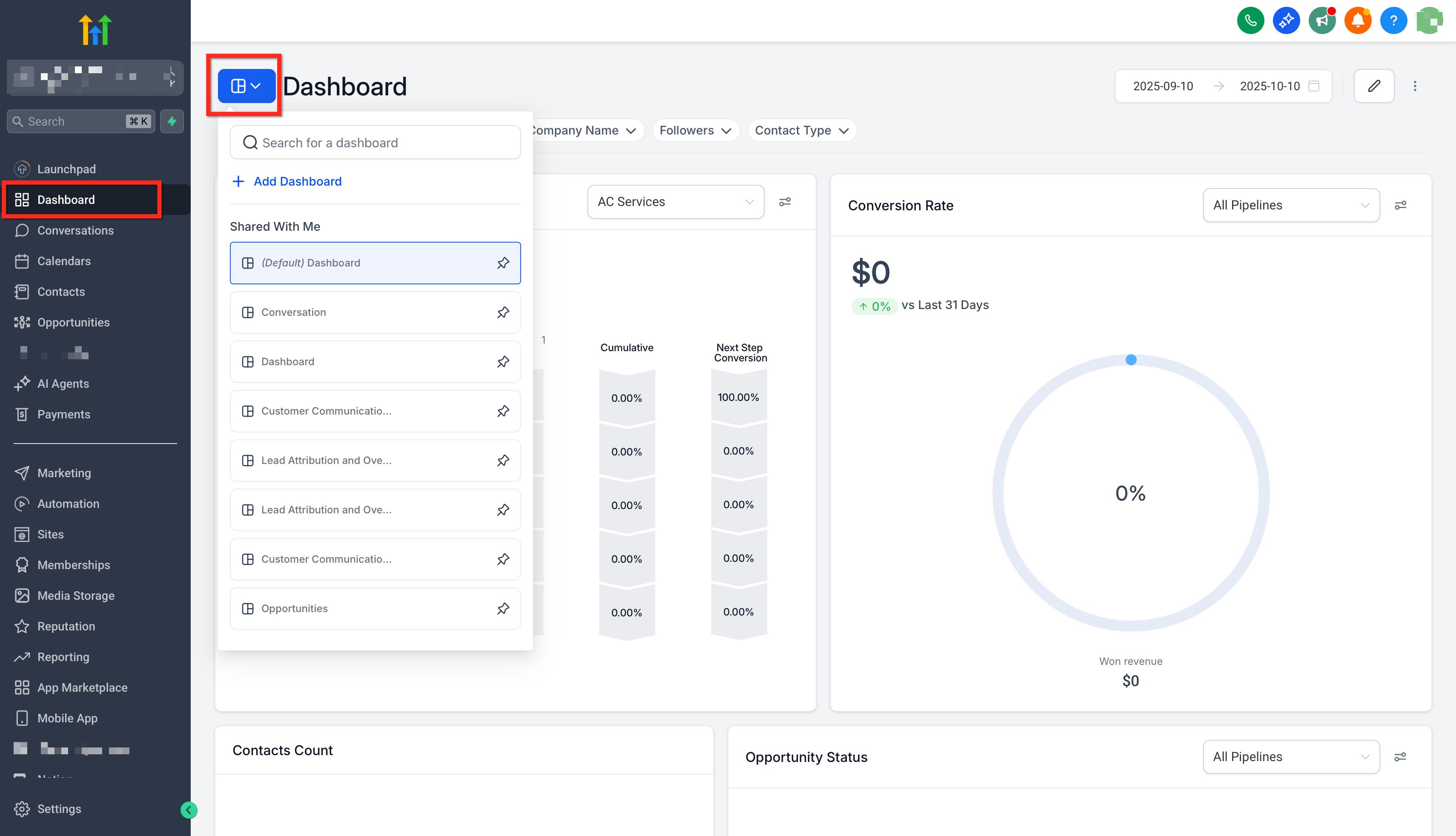 In your Sub-Account, navigate to the Dashboard and click the blue button in the top-left corner to open the desired dashboard.