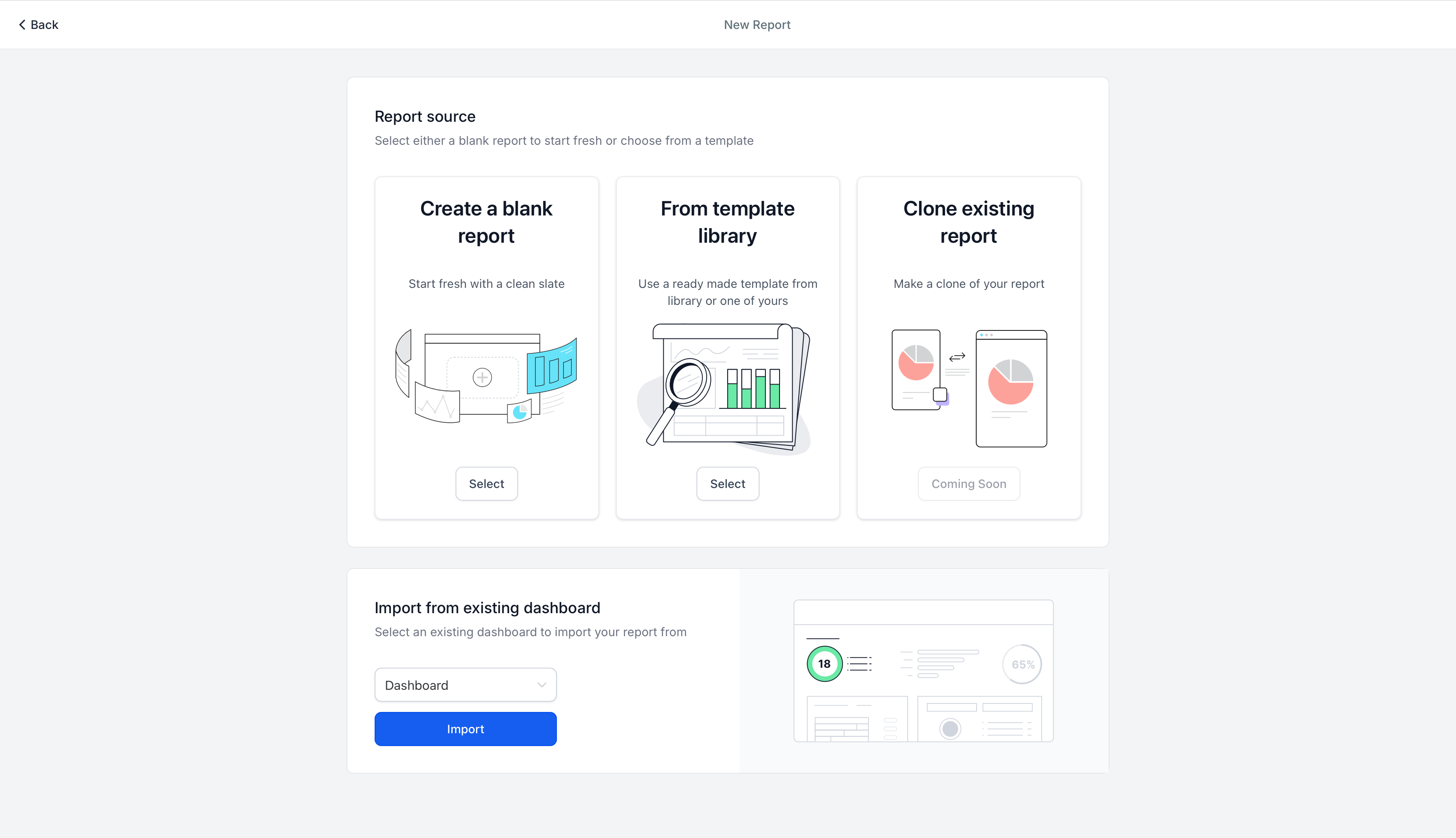 Choose to start from a blank canvas, use a template, or import an existing dashboard layout.