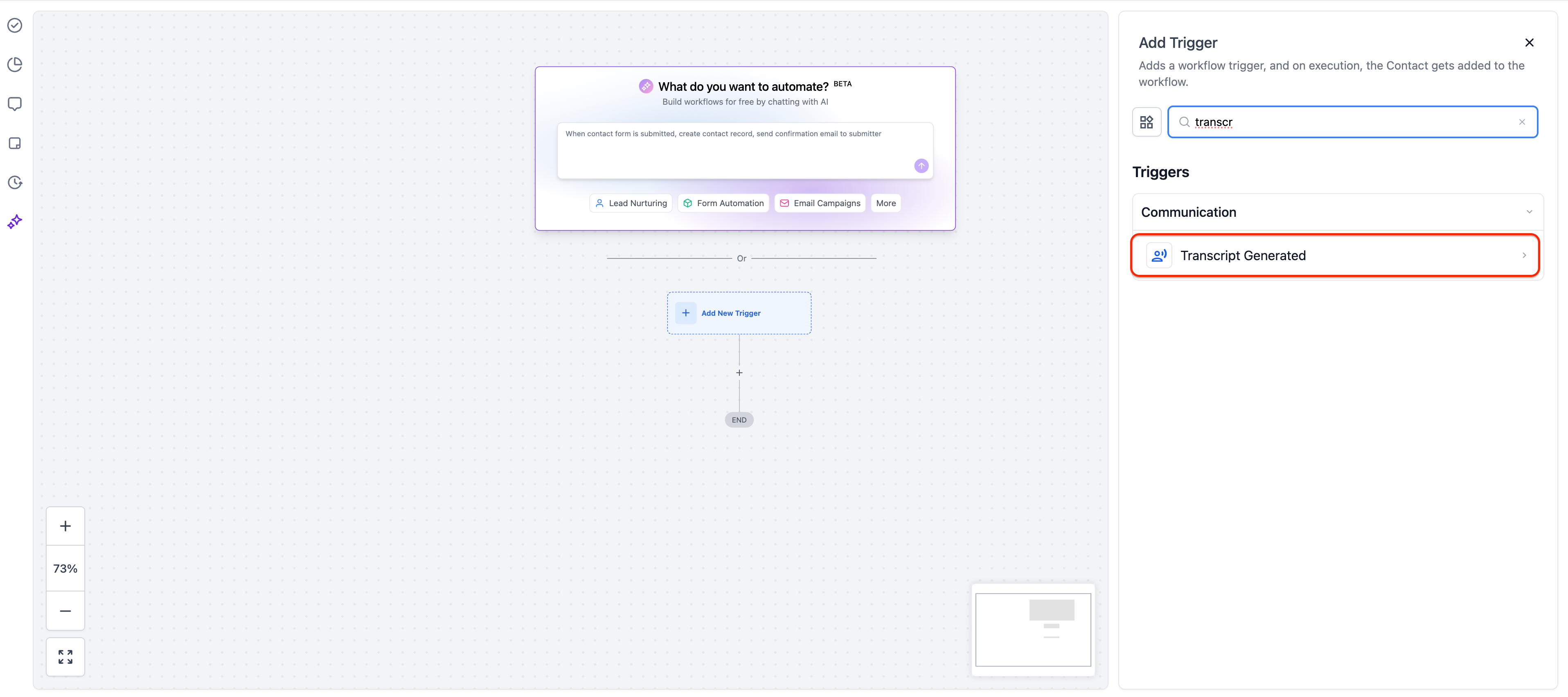 Click Add New Trigger and select Transcript Generated from the trigger list.