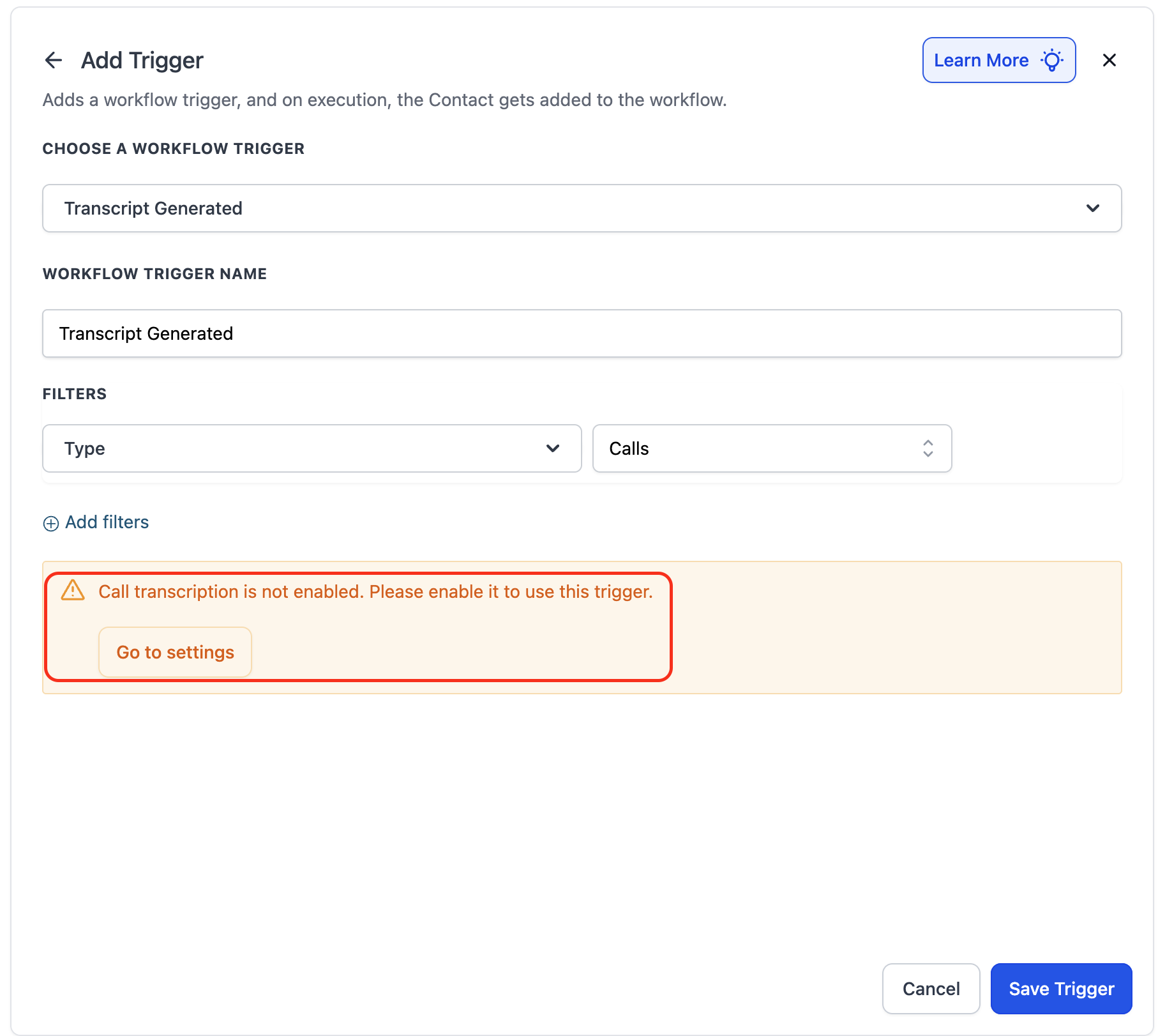 If transcription is not enabled, the workflow will display a prompt to go to settings and enable it.