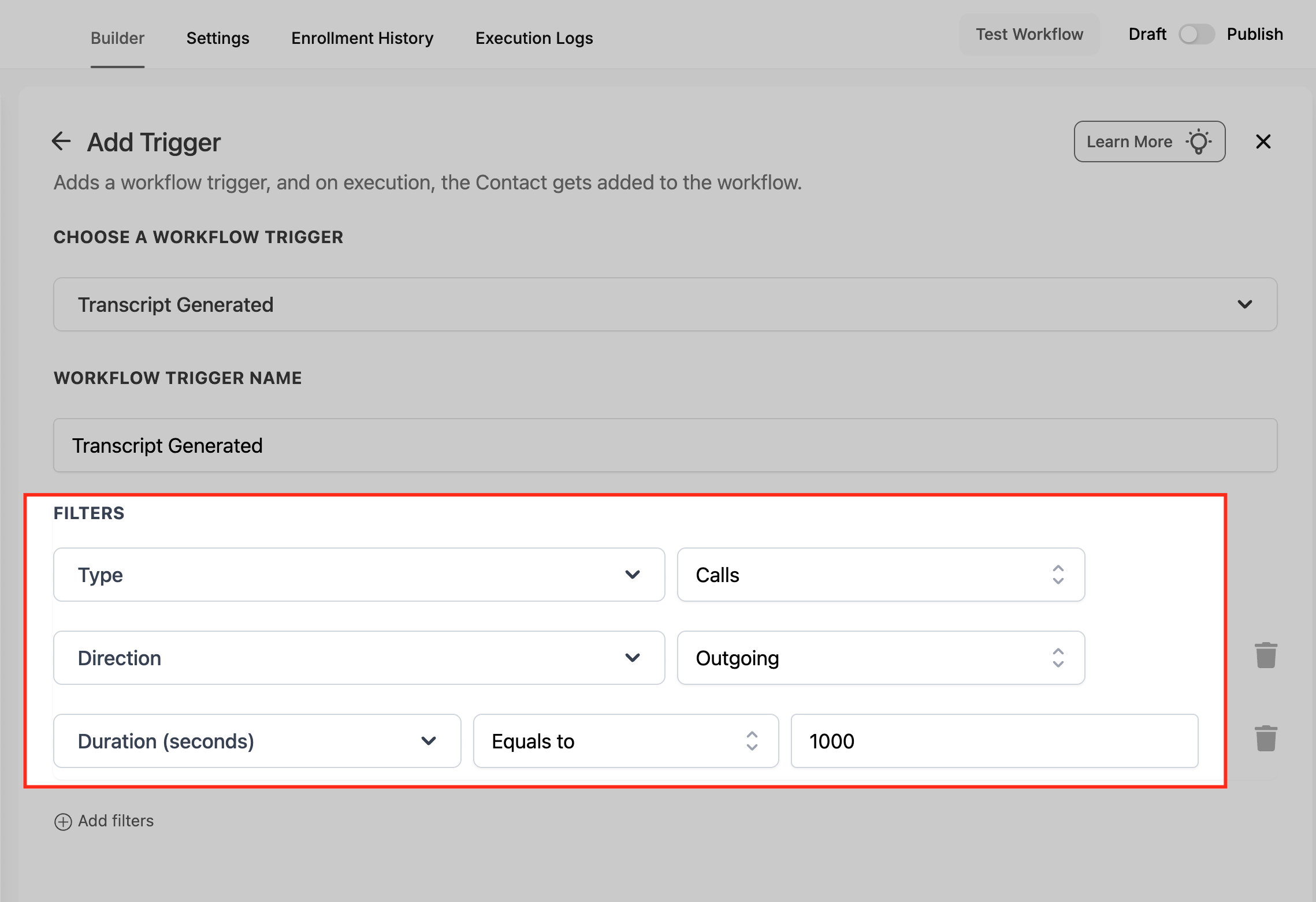 Once configured, click Save Trigger, add your desired workflow actions, and toggle the workflow from Draft to Publish to activate it.