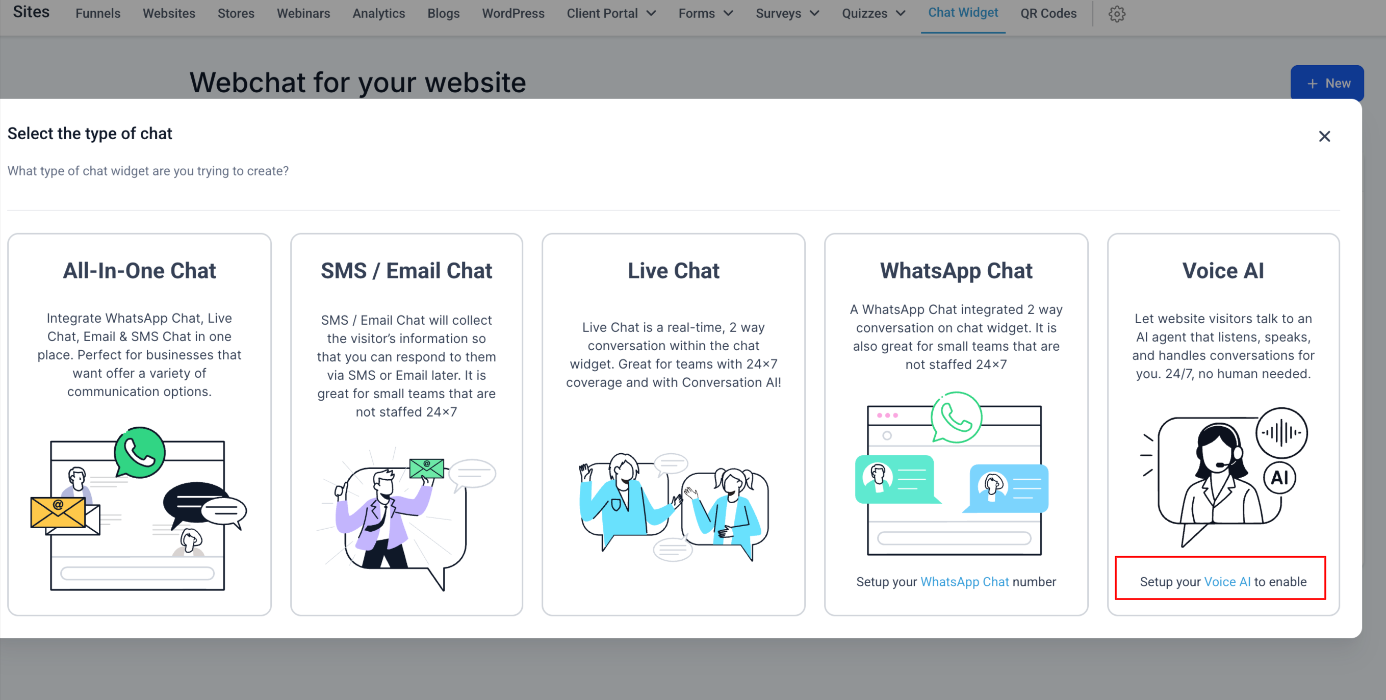 Once enabled, the Voice AI chat type becomes available in the Chat Widget builder.