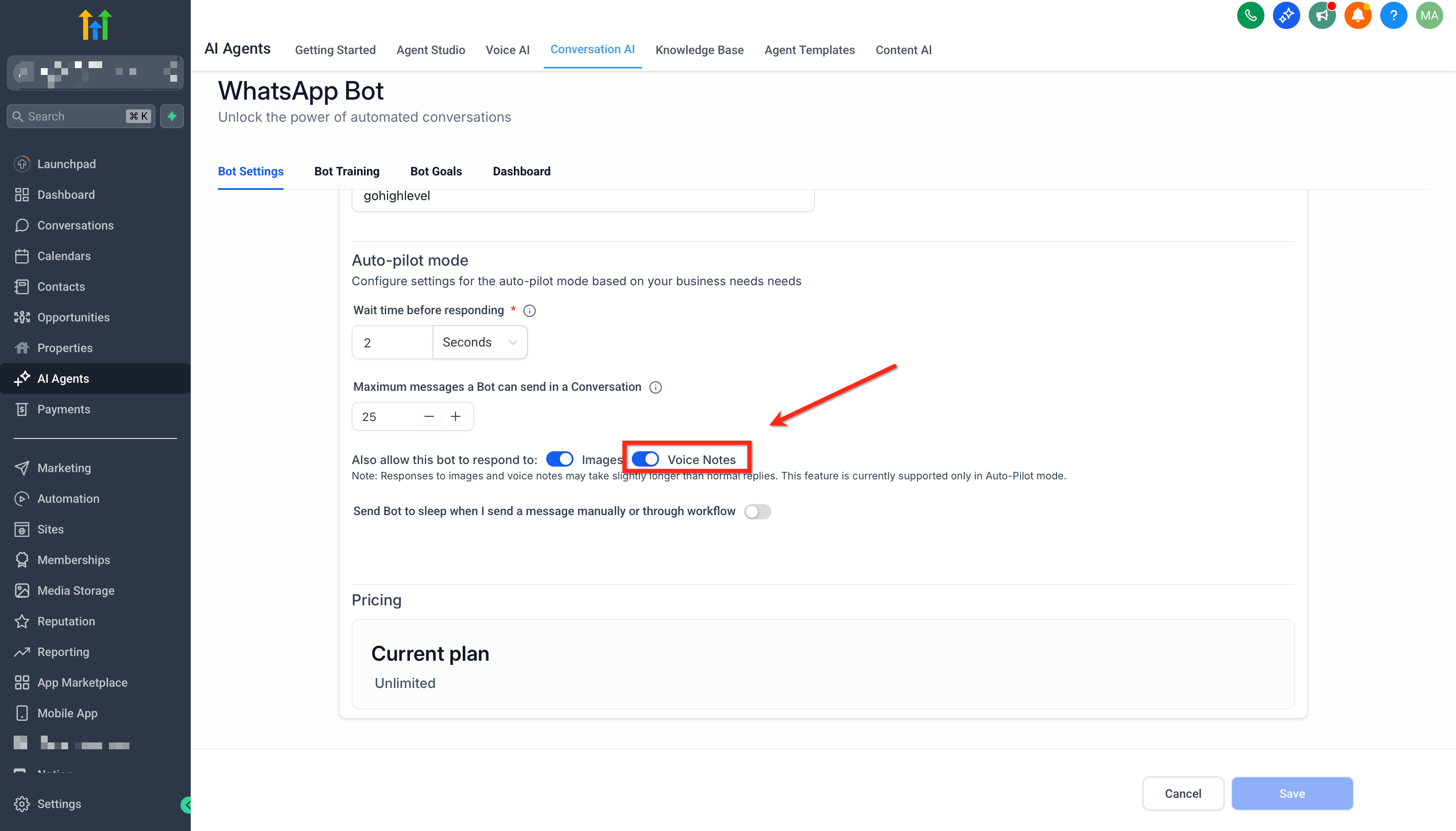 Give customers the option to speak instead of type. HighLevel’s Conversations AI understands voice notes and audio files across WhatsApp, Facebook Messenger, Instagram, and SMS/MMS. The bot transcribes speech to text and replies intelligently using your existing training and settings, keeping conversations fast and natural. This article covers supported audio types, channel compatibility, setup, and troubleshooting.