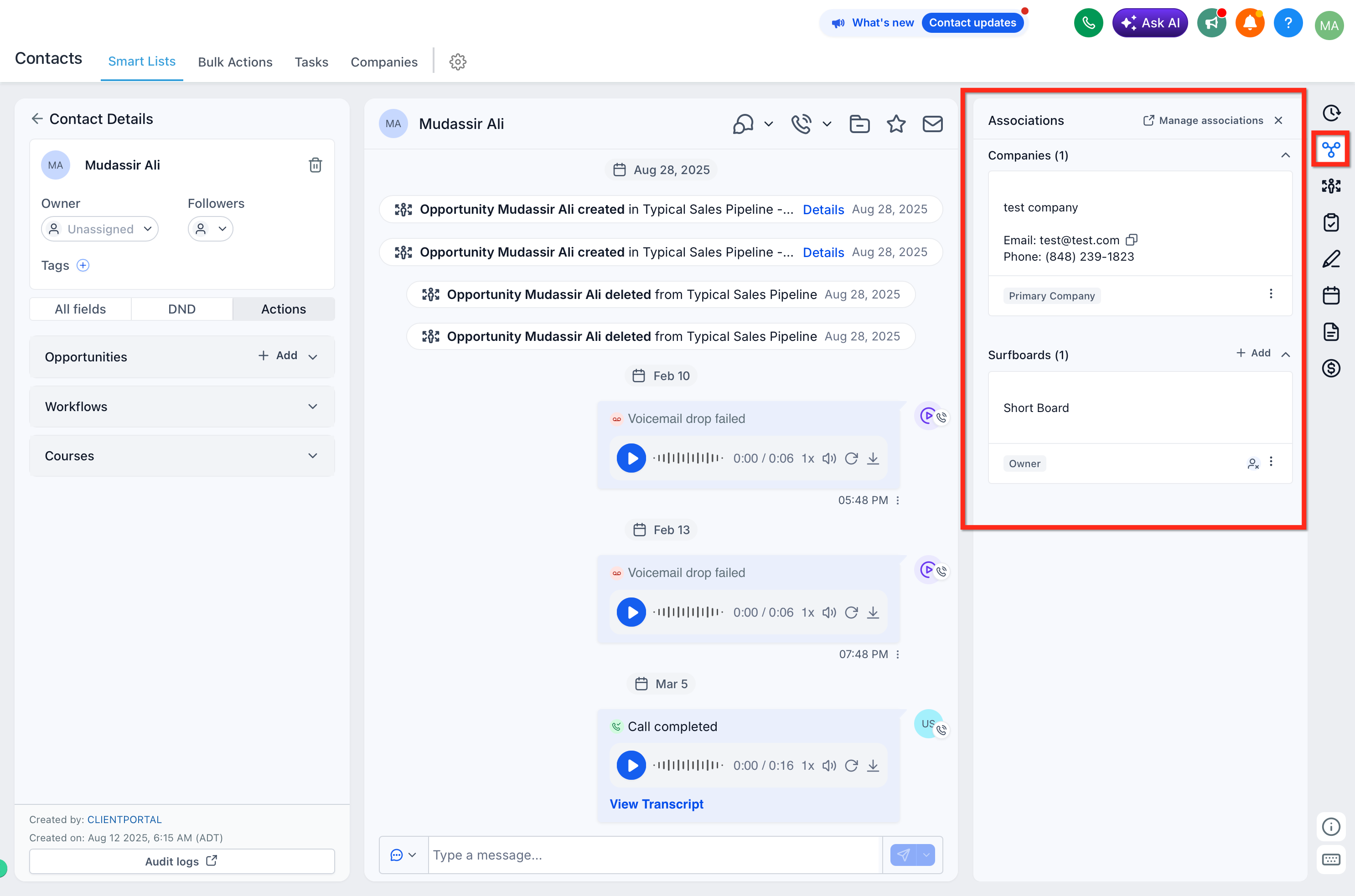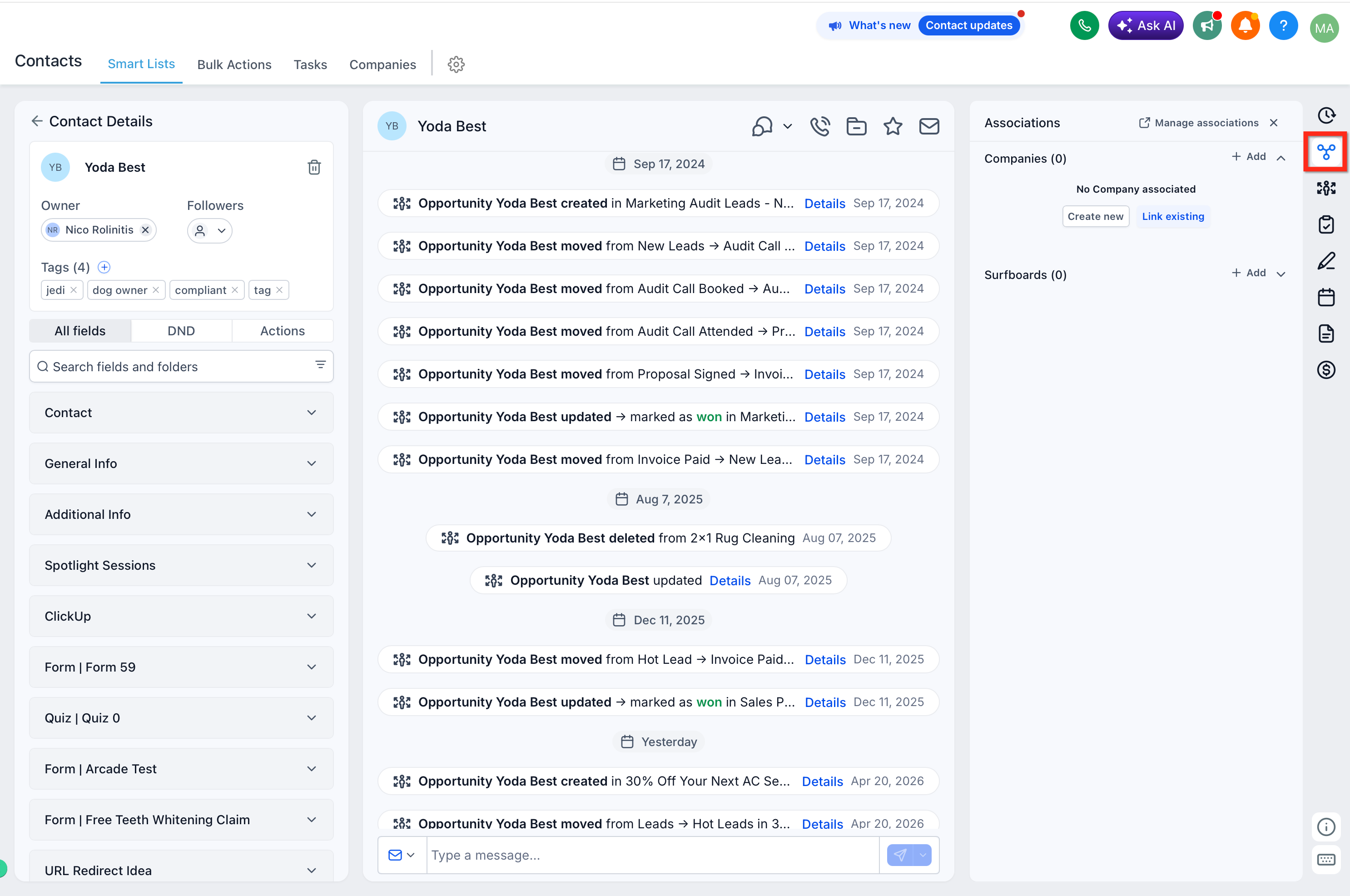 2. Associations — Add, remove, or view Companies and Custom Objects.