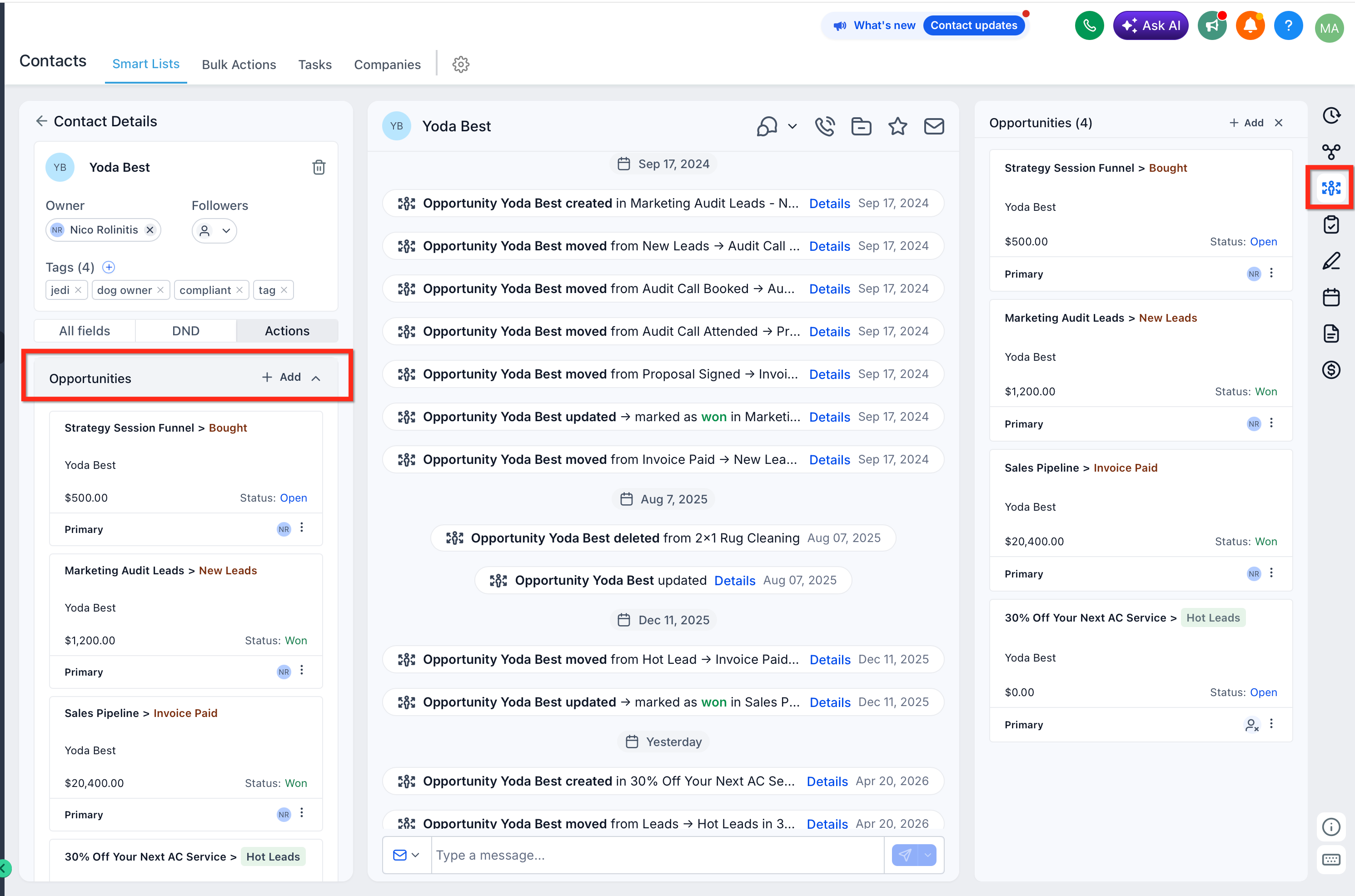 3. Opportunities — View all opportunities linked to the contact in a dedicated tab below Associations.