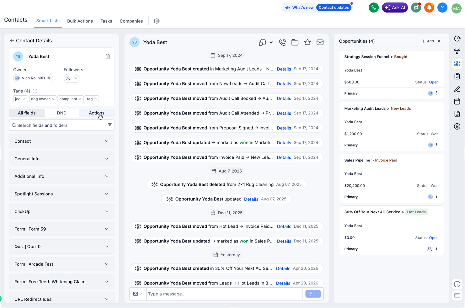 Use the Actions tab for quick utilities (like managing Opportunities, workflows and client portal).