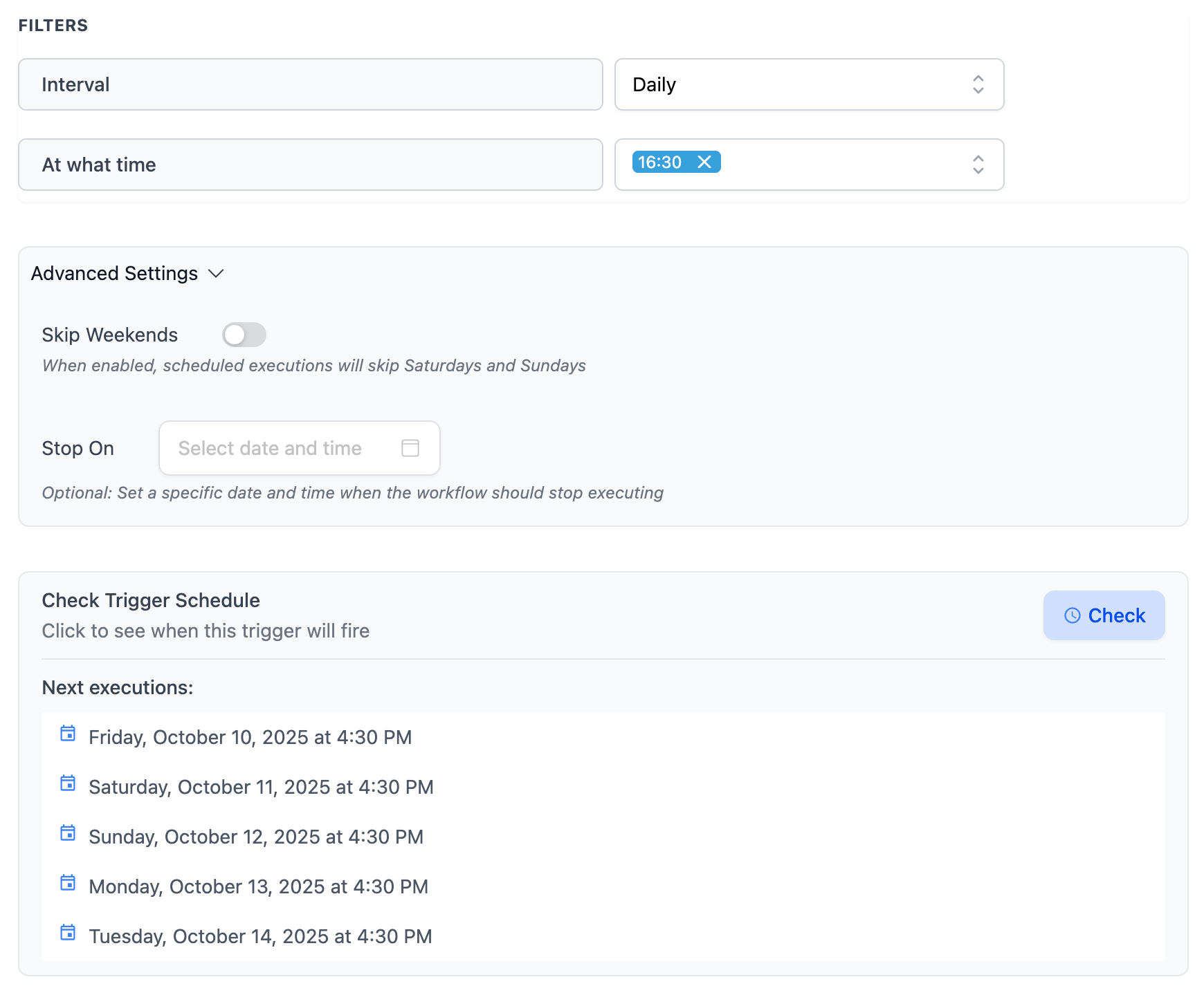 Preview the next run times using Check Trigger Schedule to confirm cadence (shows the next five executions).