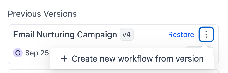 Click Restore to create a new draft, or Create new workflow from version for branching.