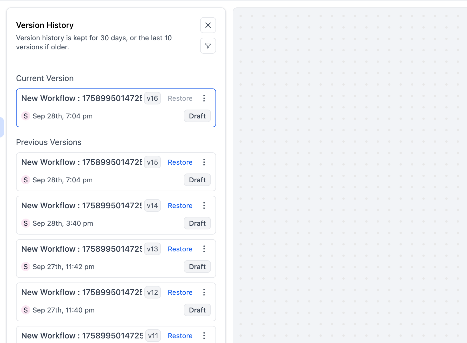 Use Version History to review past versions of a workflow and restore any version as a new draft, your live workflow doesn’t change until you Publish. This follows the same draft → publish model used across Workflow.