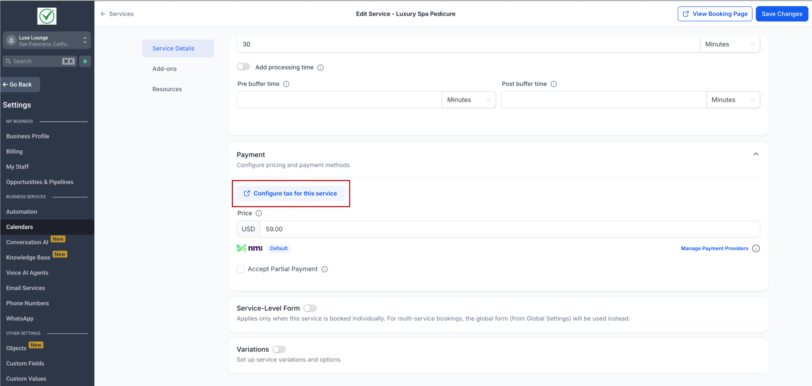 Save the Service. Future bookings will itemize the fee and tax lines automatically on the booking page, appointment record, and receipt.