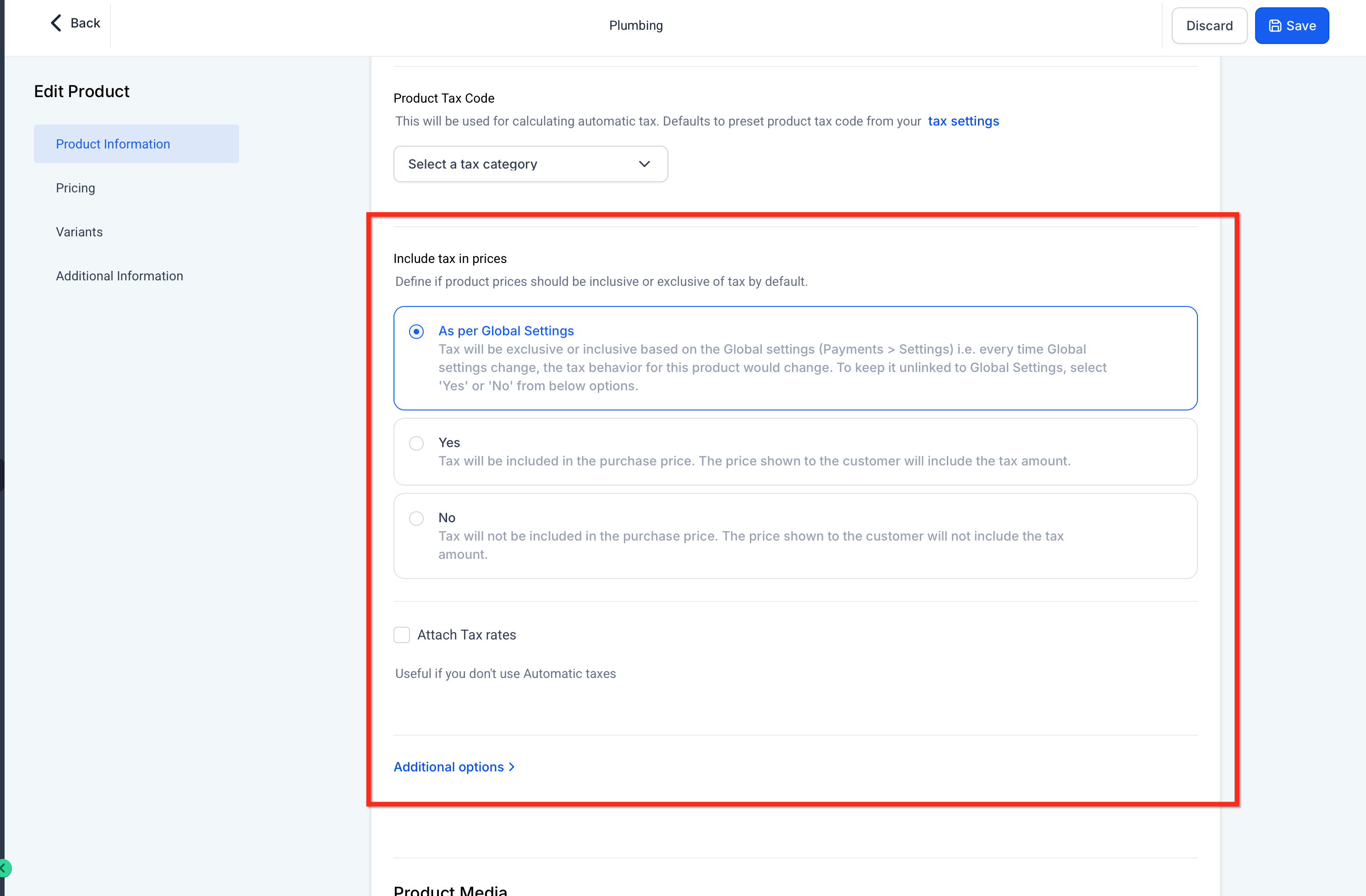 In the linked Product window, choose Add Tax Rate or select an existing rate → Save.