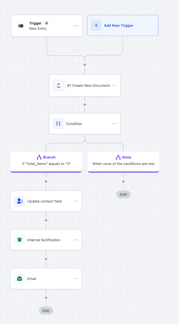 A customer submits an order through your “Order Submission Form” on Typeform. The workflow creates a new document in ClickUp with their order details. If the customer ordered exactly three items, the contact record is updated, the operations team is notified internally, and a confirmation email is sent to the customer. If the total items are not three, the workflow ends without additional actions.