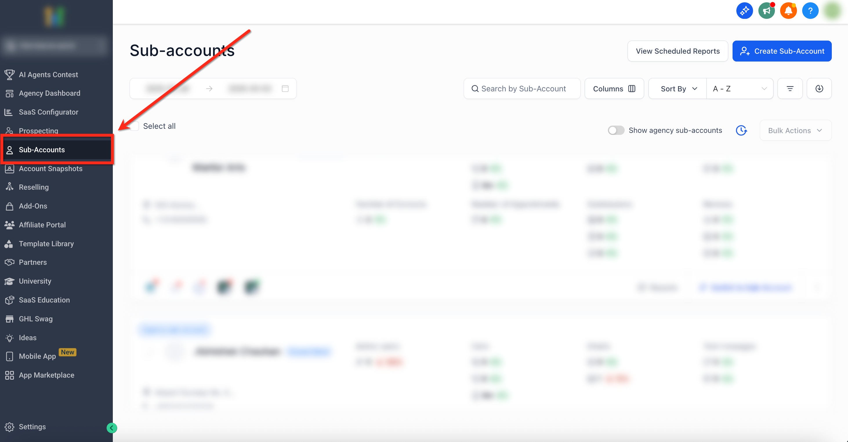 - From the Agency dashboard, select the Sub-Accounts tab on the left-side navigation bar