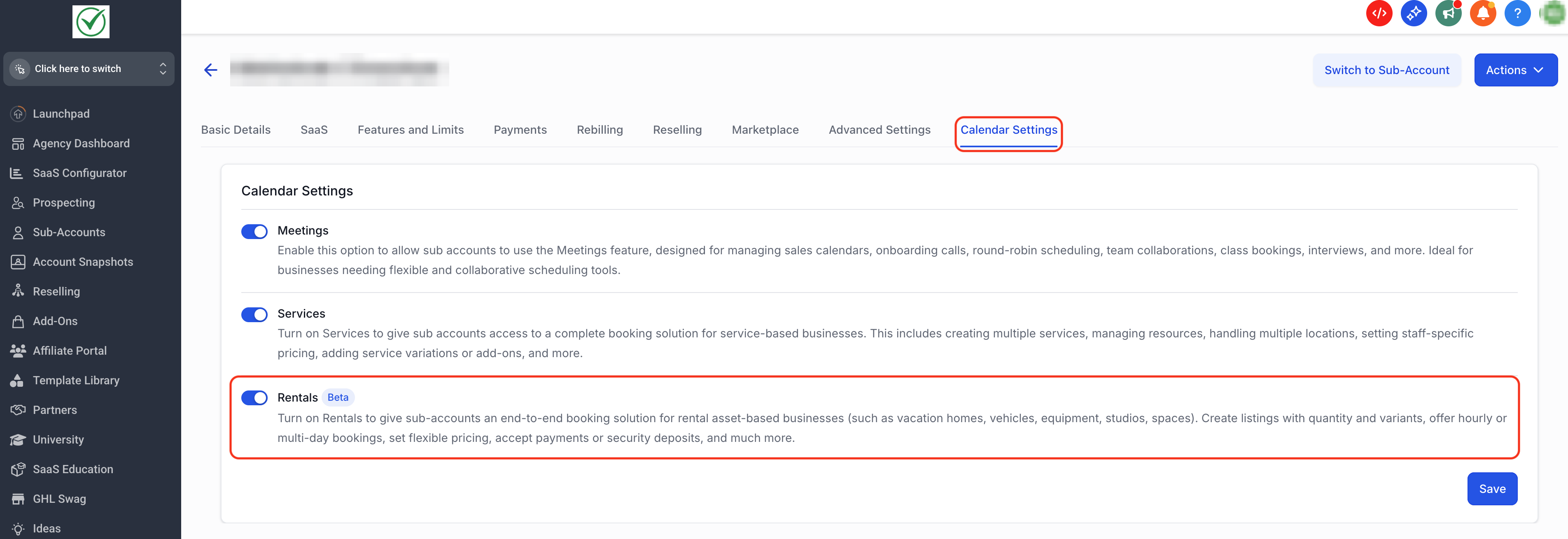 You can enable Rentals for sub-accounts directly from Agency Settings. Follow these steps to activate Rentals in a single sub-account!