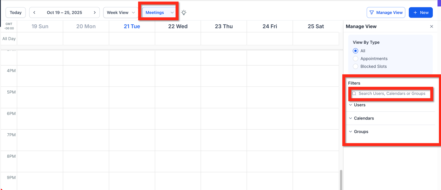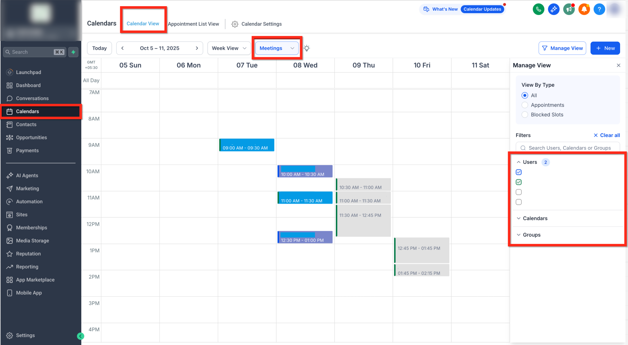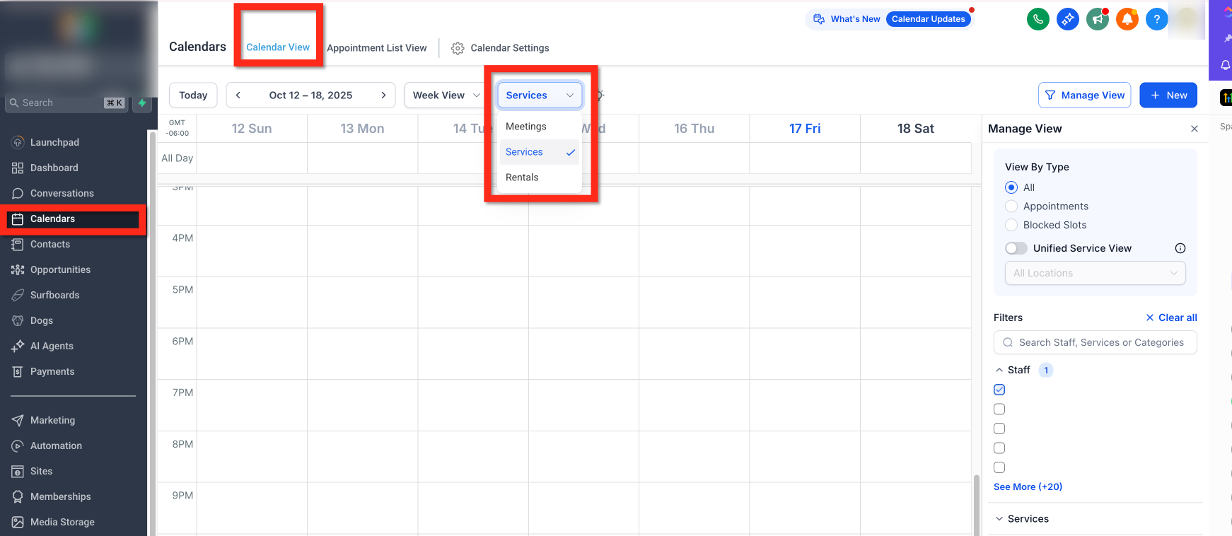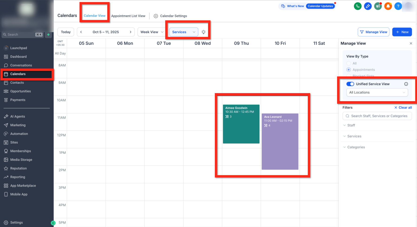 The Manage View panel on the right includes dynamic filters that adjust based on the selected scheduling type. This ensures that users only see relevant filters, such as Users, Calendars, or Groups for Meetings, and Staff, Services, or Categories for Services. Agencies offering service-based bookings can also use Unified Service View to view all service appointments across team members in a single, consolidated timeline.