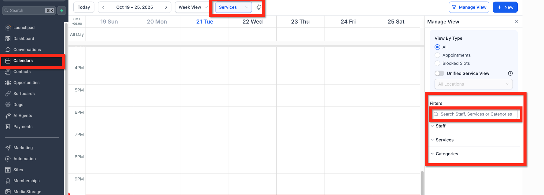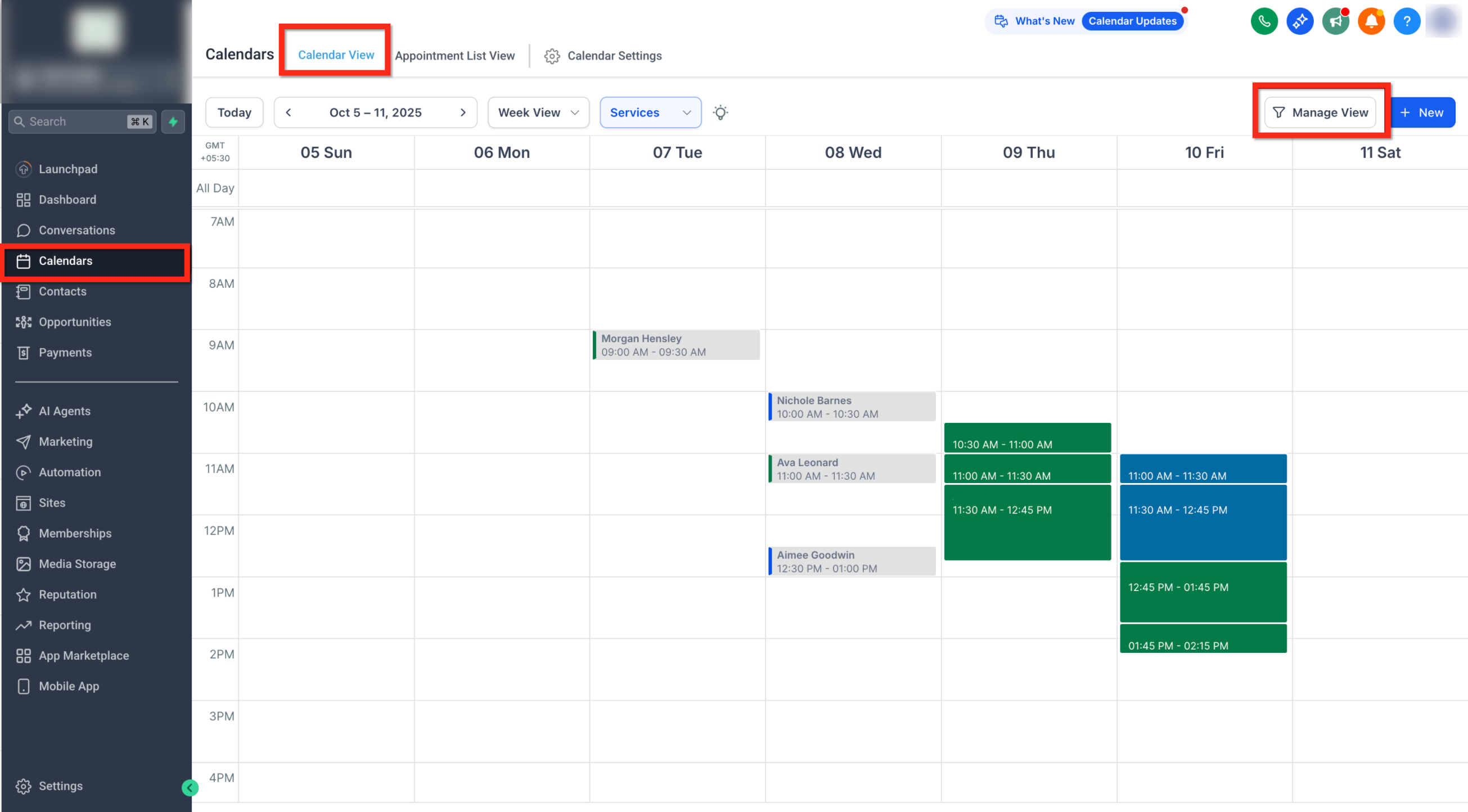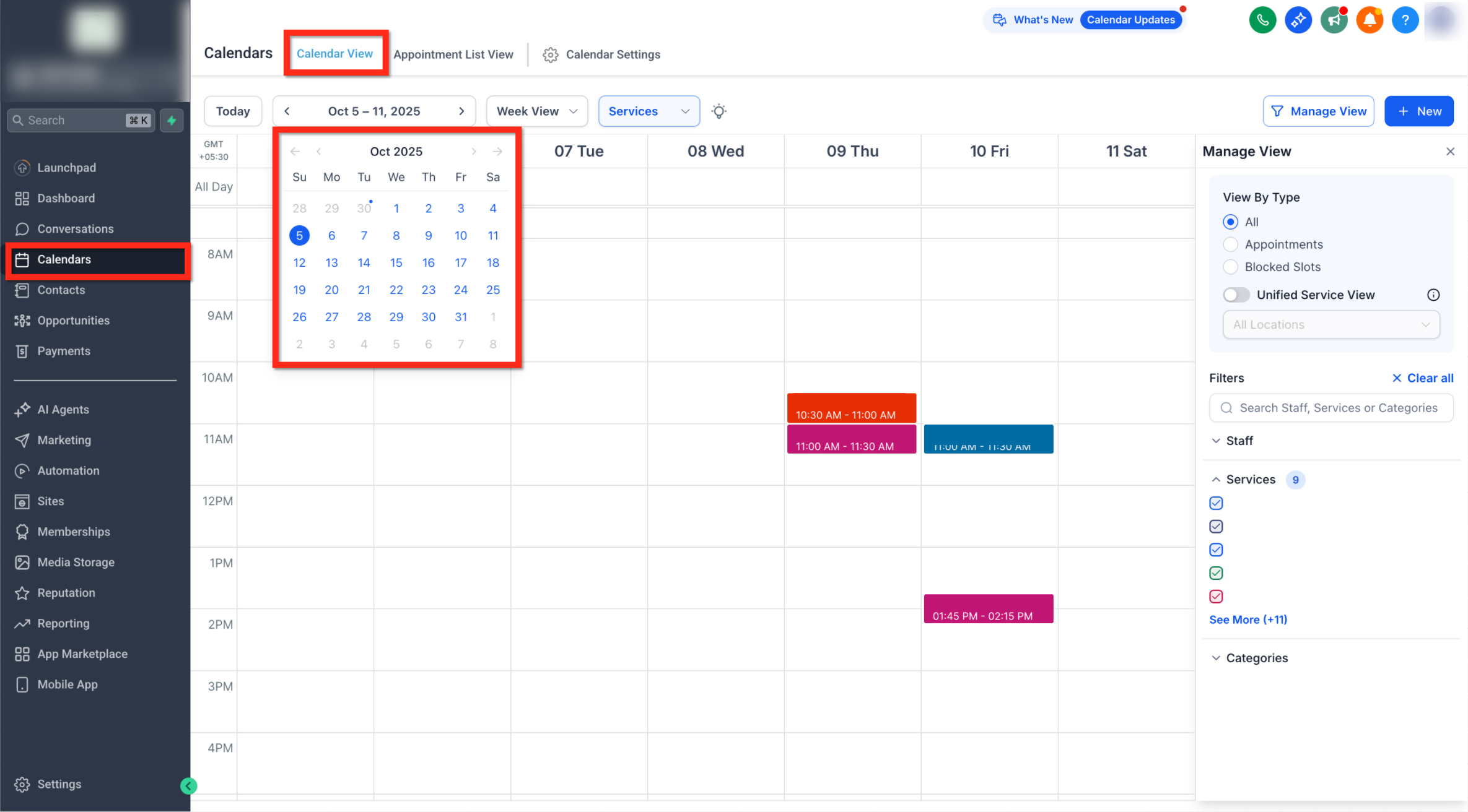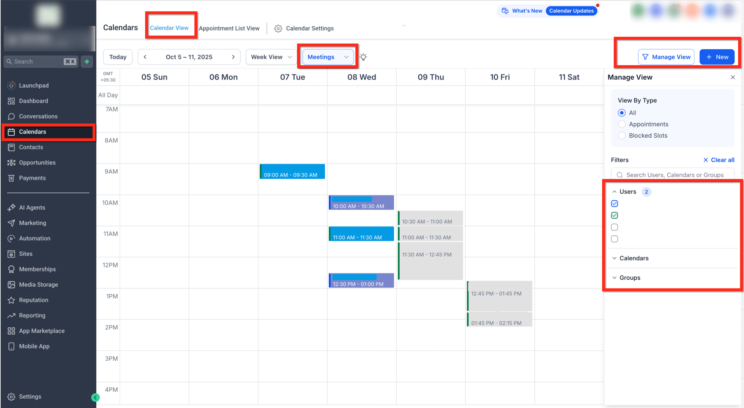 The Manage View panel on the right includes dynamic filters that adjust based on the selected scheduling type. This ensures that users only see relevant filters, such as Users, Calendars, or Groups for Meetings, and Staff, Services, or Categories for Services. Agencies offering service-based bookings can also use Unified Service View to view all service appointments across team members in a single, consolidated timeline.