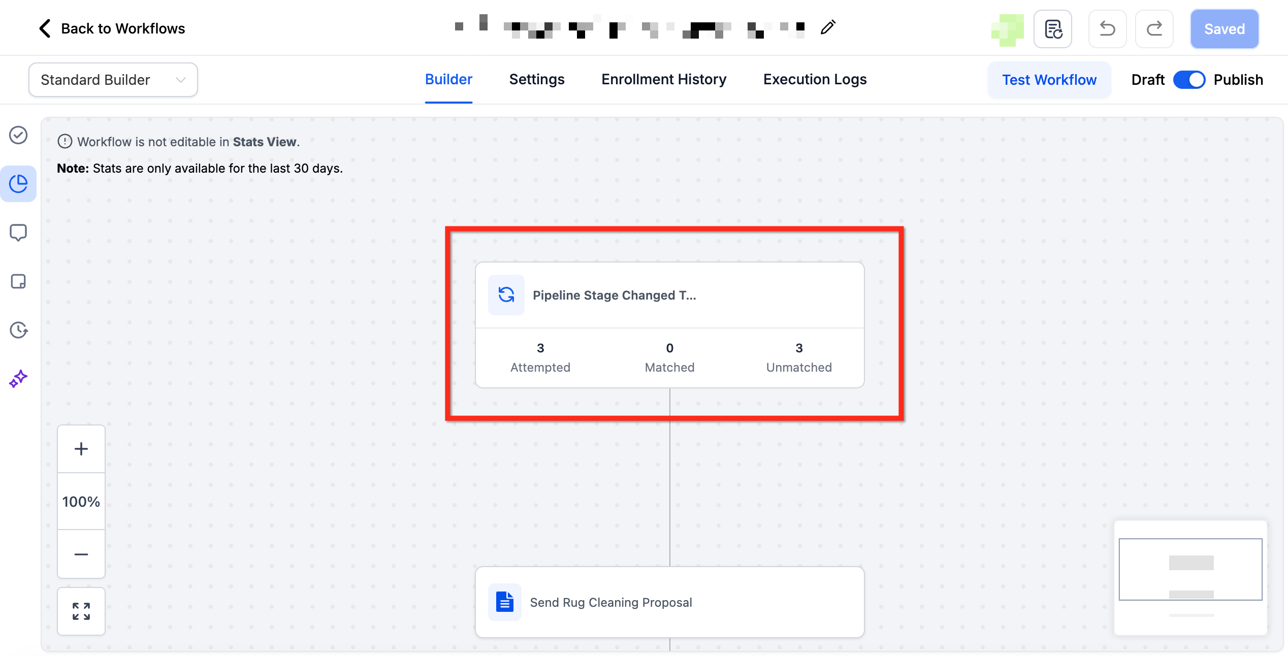 • Return to Builder (edit mode), update trigger filters or data standards, then switch back to Stats to confirm improvement.