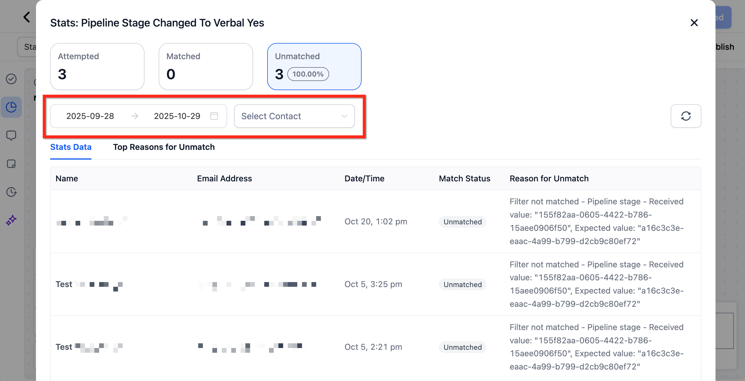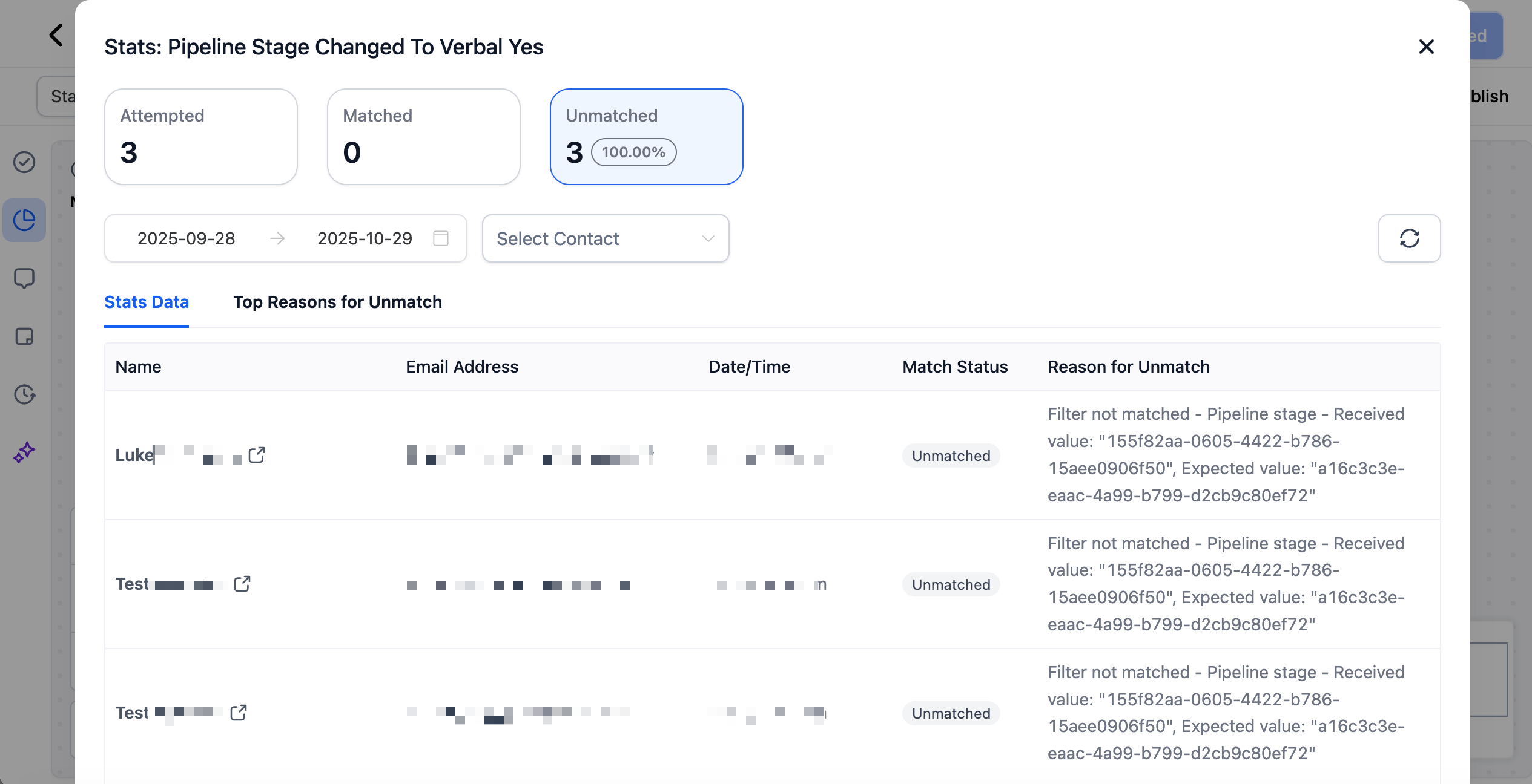 Trigger Stats gives you real-time visibility into how each workflow trigger is performing in HighLevel. See Attempted, Matched, and Unmatched counts at a glance, drill into contact-level reasons for mismatches, and filter results to validate logic quickly.
