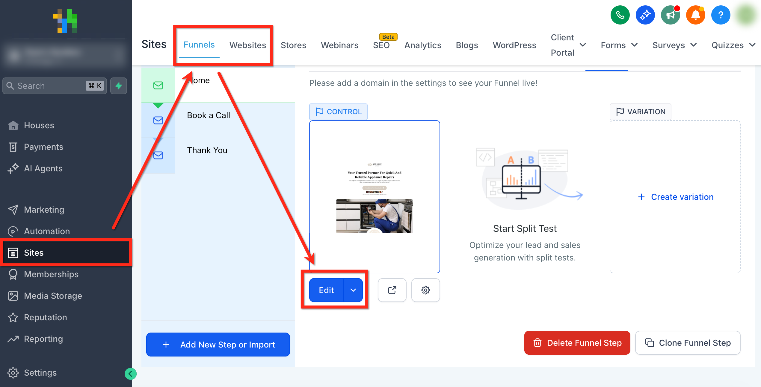 - Open the Page Builder for your funnel or website page by navigating to Sites > Funnels or Websites.