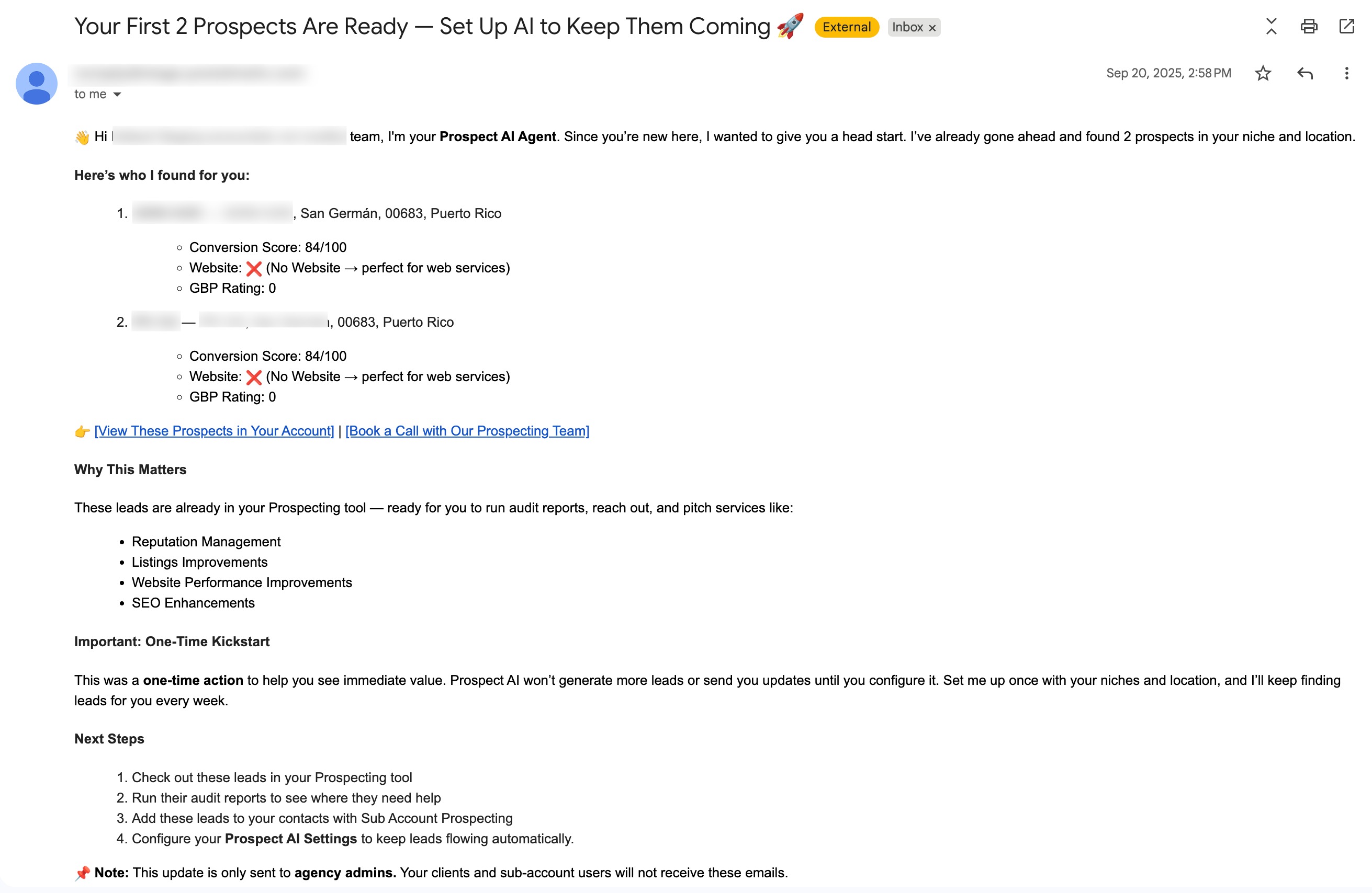Prospect AI Recommendations for New Agencies jump-starts your first outreach by delivering a one-time list of local, high-fit leads based on your business niche and location. This article explains eligibility, how recommendations are delivered, and the steps to turn early momentum into ongoing automated lead discovery with Prospect AI.