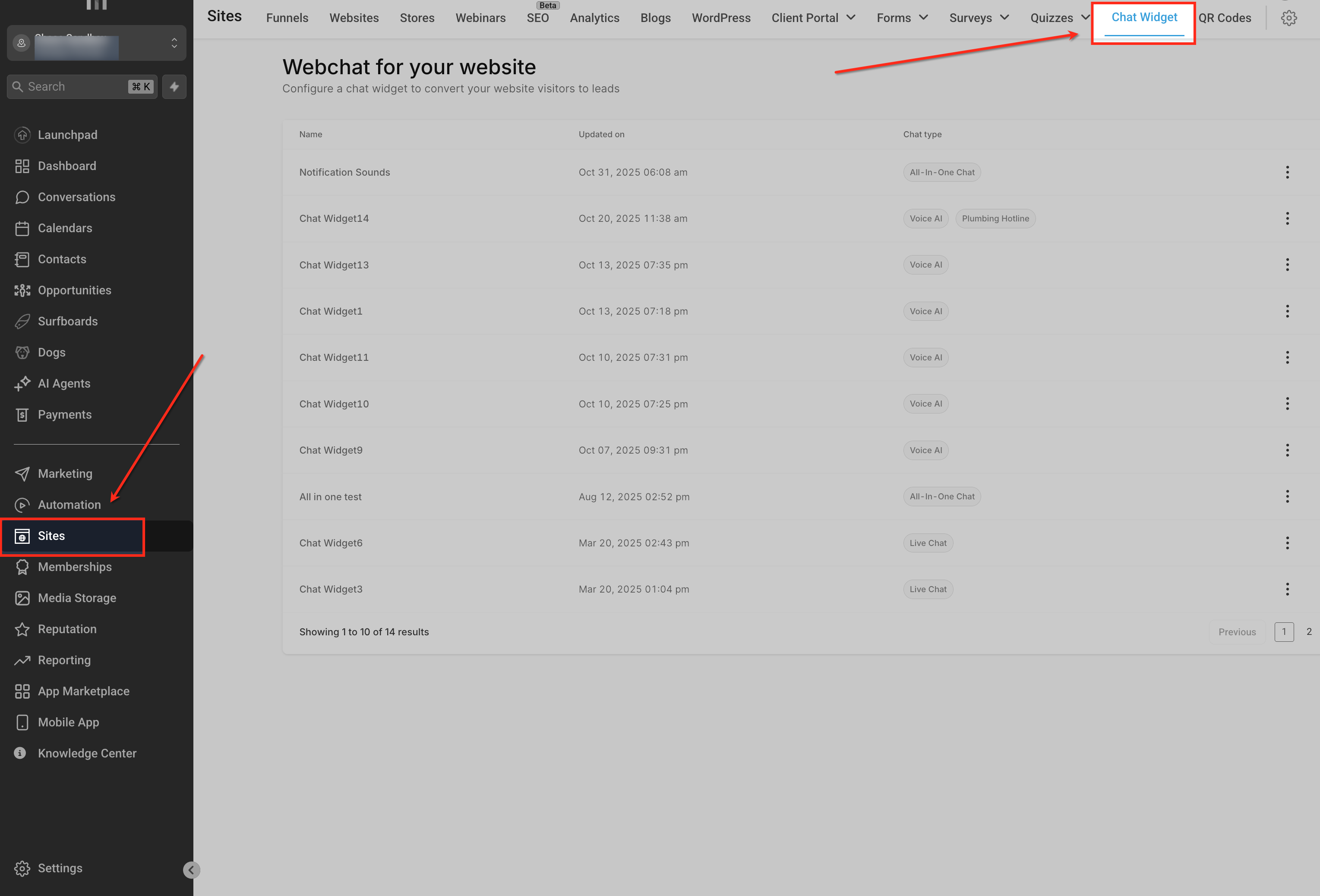 From the left-hand navigation menu, go to Sites and select Chat Widget at the top.