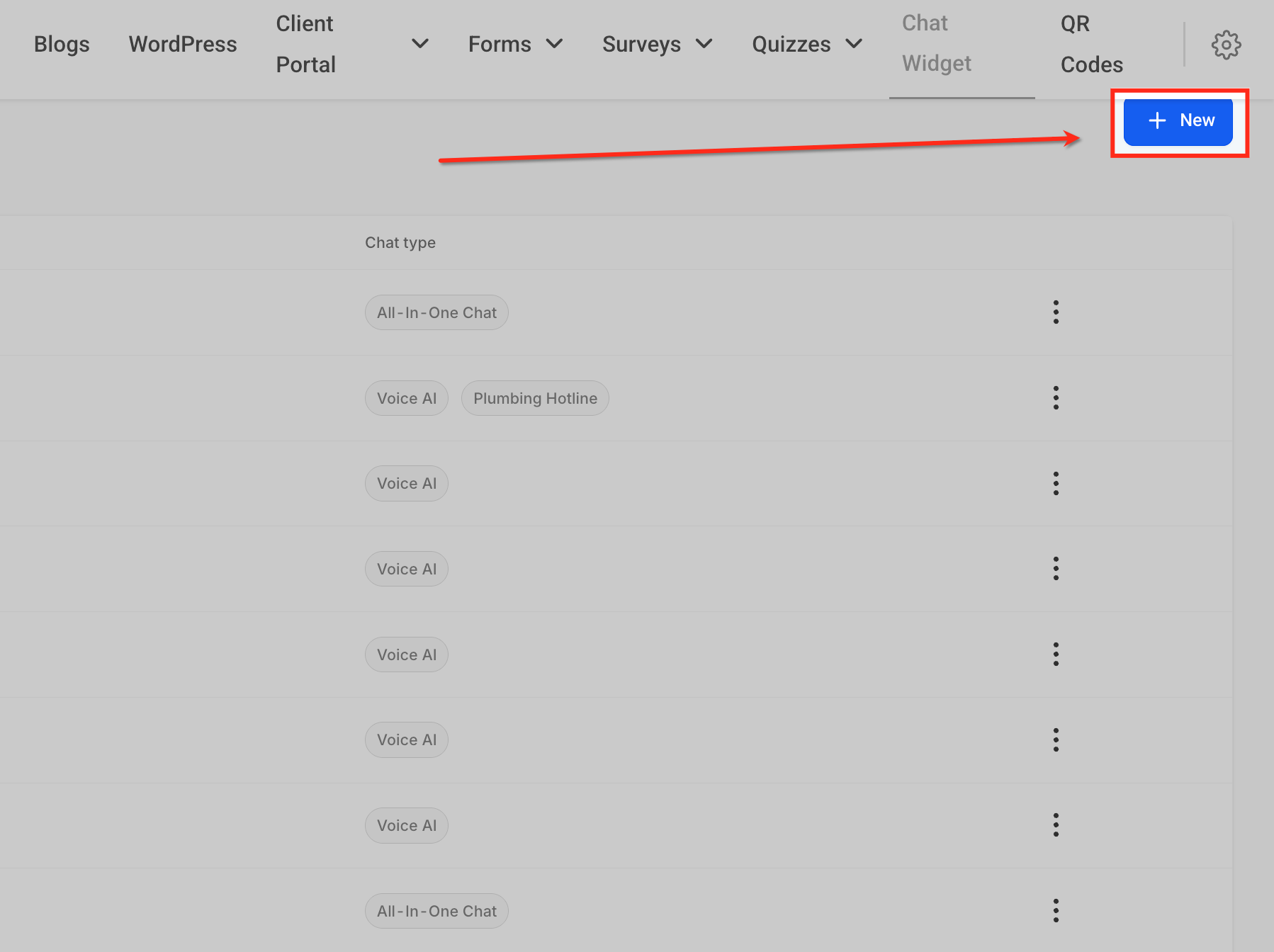 This begins the setup process, allowing you to choose the widget type (WhatsApp, Email/SMS, All-in-One Chat, or Voice AI) and start customizing its design and behavior.
