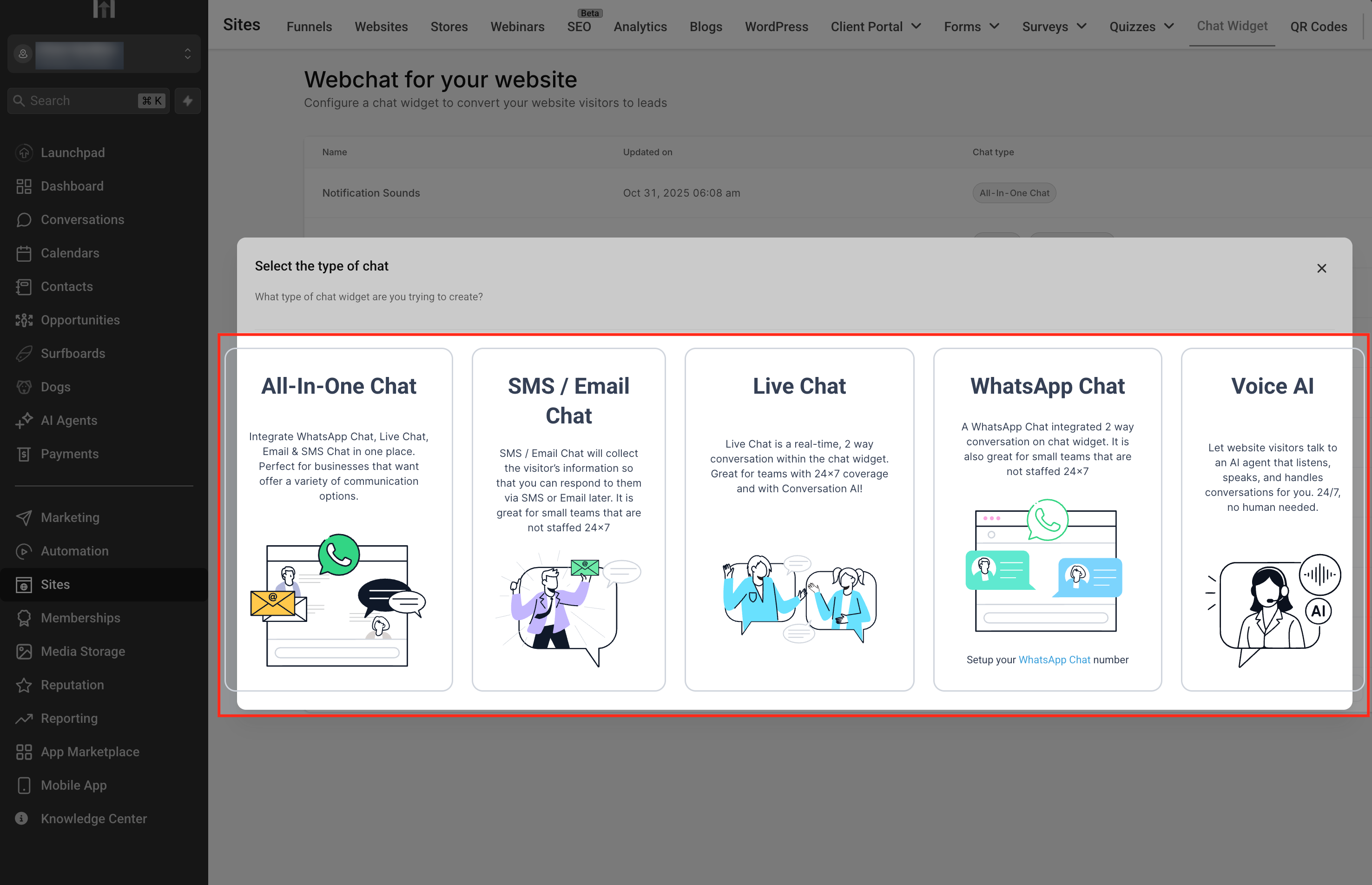Choose the type of chat widget you want to create from the available options — All-In-One Chat, SMS/Email Chat, Live Chat, WhatsApp Chat, or Voice AI.